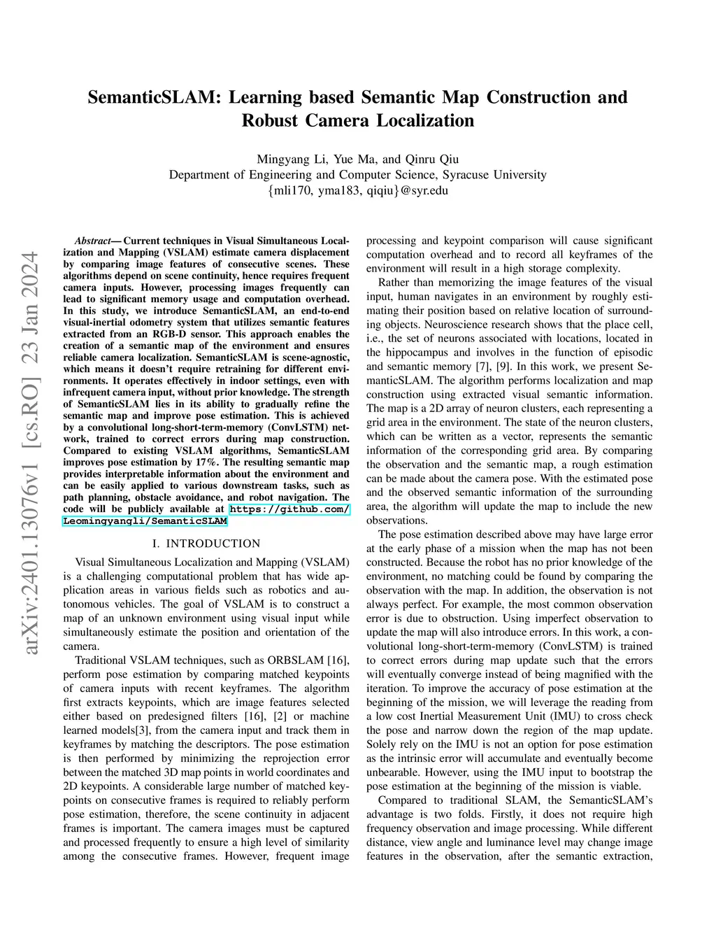 Current techniques in Visual Simultaneous Localization and Mapping (VSLAM) estimate camera displacement by comparing image features of consecutive scenes. These algorithms depend on scene continuity, hence requires frequent camera inputs. However, processing images frequently can lead to significant memory usage and computation overhead. In this study, we introduce SemanticSLAM, an end-to-end visual-inertial odometry system that utilizes semantic features extracted from an RGB-D sensor. This approach enables the creation of a semantic map of the environment and ensures reliable camera localization. SemanticSLAM is scene-agnostic, which means it doesn't require retraining for different environments. It operates effectively in indoor settings, even with infrequent camera input, without prior knowledge. The strength of SemanticSLAM lies in its ability to gradually refine the semantic map and improve pose estimation. This is achieved by a convolutional long-short-term-memory (ConvLSTM) network, trained to correct errors during map construction. Compared to existing VSLAM algorithms, SemanticSLAM improves pose estimation by 17%. The resulting semantic map provides interpretable information about the environment and can be easily applied to various downstream tasks, such as path planning, obstacle avoidance, and robot navigation. The code will be publicly available at https://github.com/Leomingyangli/SemanticSLAM