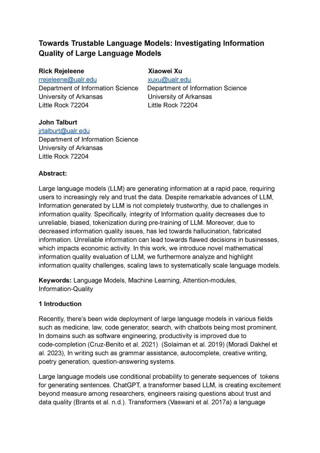 Large language models (LLM) are generating information at a rapid pace, requiring users to increasingly rely and trust the data. Despite remarkable advances of LLM, Information generated by LLM is not completely trustworthy, due to challenges in information quality. Specifically, integrity of Information quality decreases due to unreliable, biased, tokenization during pre-training of LLM. Moreover, due to decreased information quality issues, has led towards hallucination, fabricated information. Unreliable information can lead towards flawed decisions in businesses, which impacts economic activity. In this work, we introduce novel mathematical information quality evaluation of LLM, we furthermore analyze and highlight information quality challenges, scaling laws to systematically scale language models.