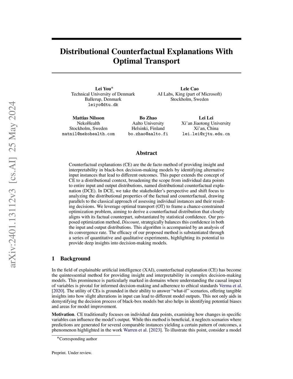 Counterfactual explanations (CE) are the de facto method for providing insights into black-box decision-making models by identifying alternative inputs that lead to different outcomes. However, existing CE approaches, including group and global methods, focus predominantly on specific input modifications, lacking the ability to capture nuanced distributional characteristics that influence model outcomes across the entire input-output spectrum. This paper proposes distributional counterfactual explanation (DCE), shifting focus to the distributional properties of observed and counterfactual data, thus providing broader insights. DCE is particularly beneficial for stakeholders making strategic decisions based on statistical data analysis, as it makes the statistical distribution of the counterfactual resembles the one of the factual when aligning model outputs with a target distribution\textemdash something that the existing CE methods cannot fully achieve. We leverage optimal transport (OT) to formulate a chance-constrained optimization problem, deriving a counterfactual distribution aligned with its factual counterpart, supported by statistical confidence. The efficacy of this approach is demonstrated through experiments, highlighting its potential to provide deeper insights into decision-making models.