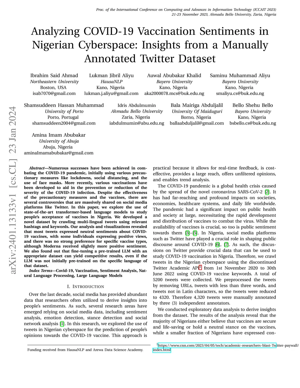 Numerous successes have been achieved in combating the COVID-19 pandemic, initially using various precautionary measures like lockdowns, social distancing, and the use of face masks. More recently, various vaccinations have been developed to aid in the prevention or reduction of the severity of the COVID-19 infection. Despite the effectiveness of the precautionary measures and the vaccines, there are several controversies that are massively shared on social media platforms like Twitter. In this paper, we explore the use of state-of-the-art transformer-based language models to study people's acceptance of vaccines in Nigeria. We developed a novel dataset by crawling multi-lingual tweets using relevant hashtags and keywords. Our analysis and visualizations revealed that most tweets expressed neutral sentiments about COVID-19 vaccines, with some individuals expressing positive views, and there was no strong preference for specific vaccine types, although Moderna received slightly more positive sentiment. We also found out that fine-tuning a pre-trained LLM with an appropriate dataset can yield competitive results, even if the LLM was not initially pre-trained on the specific language of that dataset.