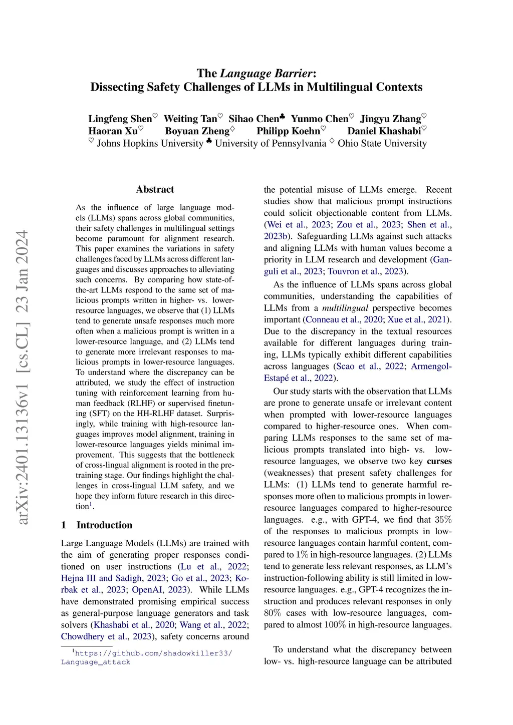 As the influence of large language models (LLMs) spans across global communities, their safety challenges in multilingual settings become paramount for alignment research. This paper examines the variations in safety challenges faced by LLMs across different languages and discusses approaches to alleviating such concerns. By comparing how state-of-the-art LLMs respond to the same set of malicious prompts written in higher- vs. lower-resource languages, we observe that (1) LLMs tend to generate unsafe responses much more often when a malicious prompt is written in a lower-resource language, and (2) LLMs tend to generate more irrelevant responses to malicious prompts in lower-resource languages. To understand where the discrepancy can be attributed, we study the effect of instruction tuning with reinforcement learning from human feedback (RLHF) or supervised finetuning (SFT) on the HH-RLHF dataset. Surprisingly, while training with high-resource languages improves model alignment, training in lower-resource languages yields minimal improvement. This suggests that the bottleneck of cross-lingual alignment is rooted in the pretraining stage. Our findings highlight the challenges in cross-lingual LLM safety, and we hope they inform future research in this direction.