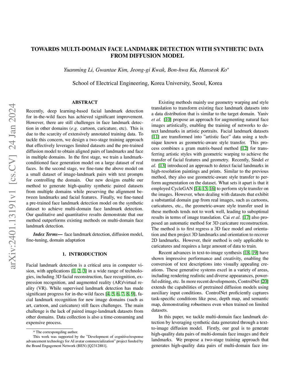 Recently, deep learning-based facial landmark detection for in-the-wild faces has achieved significant improvement. However, there are still challenges in face landmark detection in other domains (e.g. cartoon, caricature, etc). This is due to the scarcity of extensively annotated training data. To tackle this concern, we design a two-stage training approach that effectively leverages limited datasets and the pre-trained diffusion model to obtain aligned pairs of landmarks and face in multiple domains. In the first stage, we train a landmark-conditioned face generation model on a large dataset of real faces. In the second stage, we fine-tune the above model on a small dataset of image-landmark pairs with text prompts for controlling the domain. Our new designs enable our method to generate high-quality synthetic paired datasets from multiple domains while preserving the alignment between landmarks and facial features. Finally, we fine-tuned a pre-trained face landmark detection model on the synthetic dataset to achieve multi-domain face landmark detection. Our qualitative and quantitative results demonstrate that our method outperforms existing methods on multi-domain face landmark detection.