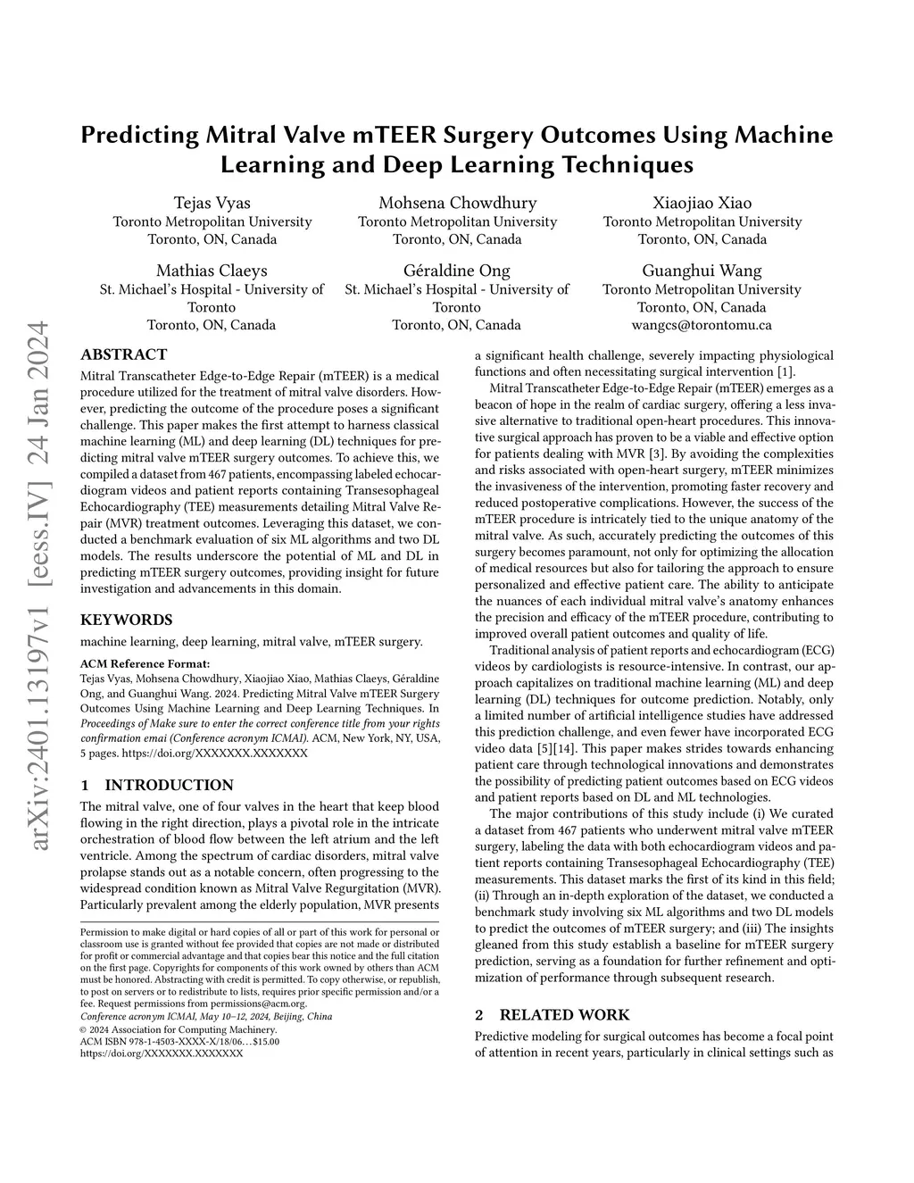 Mitral Transcatheter Edge-to-Edge Repair (mTEER) is a medical procedure utilized for the treatment of mitral valve disorders. However, predicting the outcome of the procedure poses a significant challenge. This paper makes the first attempt to harness classical machine learning (ML) and deep learning (DL) techniques for predicting mitral valve mTEER surgery outcomes. To achieve this, we compiled a dataset from 467 patients, encompassing labeled echocardiogram videos and patient reports containing Transesophageal Echocardiography (TEE) measurements detailing Mitral Valve Repair (MVR) treatment outcomes. Leveraging this dataset, we conducted a benchmark evaluation of six ML algorithms and two DL models. The results underscore the potential of ML and DL in predicting mTEER surgery outcomes, providing insight for future investigation and advancements in this domain.