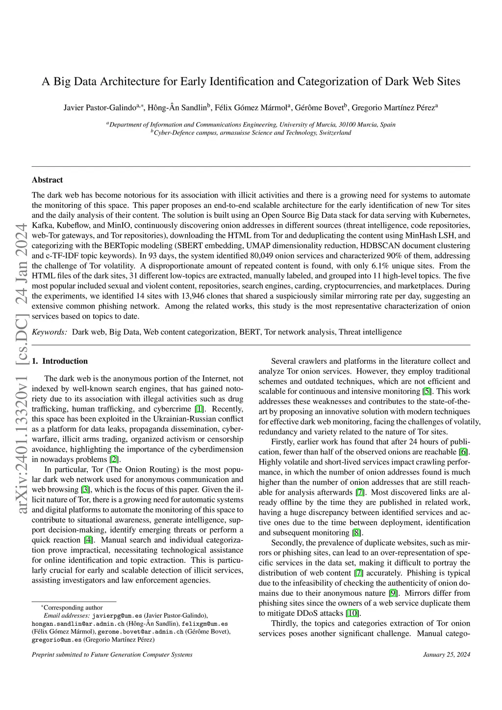The dark web has become notorious for its association with illicit activities and there is a growing need for systems to automate the monitoring of this space. This paper proposes an end-to-end scalable architecture for the early identification of new Tor sites and the daily analysis of their content. The solution is built using an Open Source Big Data stack for data serving with Kubernetes, Kafka, Kubeflow, and MinIO, continuously discovering onion addresses in different sources (threat intelligence, code repositories, web-Tor gateways, and Tor repositories), downloading the HTML from Tor and deduplicating the content using MinHash LSH, and categorizing with the BERTopic modeling (SBERT embedding, UMAP dimensionality reduction, HDBSCAN document clustering and c-TF-IDF topic keywords). In 93 days, the system identified 80,049 onion services and characterized 90% of them, addressing the challenge of Tor volatility. A disproportionate amount of repeated content is found, with only 6.1% unique sites. From the HTML files of the dark sites, 31 different low-topics are extracted, manually labeled, and grouped into 11 high-level topics. The five most popular included sexual and violent content, repositories, search engines, carding, cryptocurrencies, and marketplaces. During the experiments, we identified 14 sites with 13,946 clones that shared a suspiciously similar mirroring rate per day, suggesting an extensive common phishing network. Among the related works, this study is the most representative characterization of onion services based on topics to date.