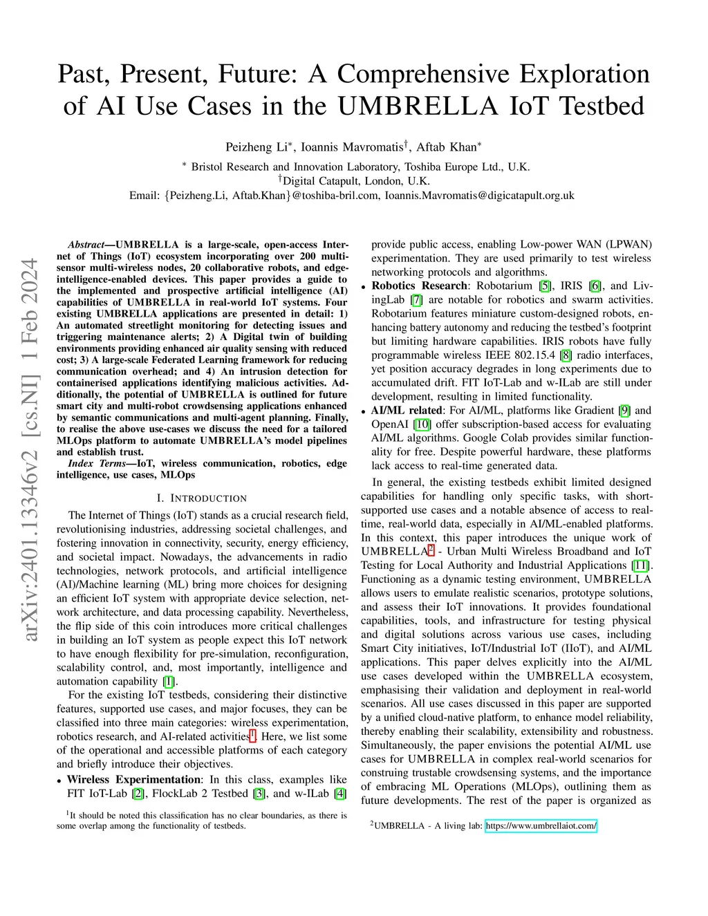 UMBRELLA is a large-scale, open-access Internet of Things (IoT) ecosystem incorporating over 200 multi-sensor multi-wireless nodes, 20 collaborative robots, and edge-intelligence-enabled devices. This paper provides a guide to the implemented and prospective artificial intelligence (AI) capabilities of UMBRELLA in real-world IoT systems. Four existing UMBRELLA applications are presented in detail: 1) An automated streetlight monitoring for detecting issues and triggering maintenance alerts; 2) A Digital twin of building environments providing enhanced air quality sensing with reduced cost; 3) A large-scale Federated Learning framework for reducing communication overhead; and 4) An intrusion detection for containerised applications identifying malicious activities. Additionally, the potential of UMBRELLA is outlined for future smart city and multi-robot crowdsensing applications enhanced by semantic communications and multi-agent planning. Finally, to realise the above use-cases we discuss the need for a tailored MLOps platform to automate UMBRELLA model pipelines and establish trust.