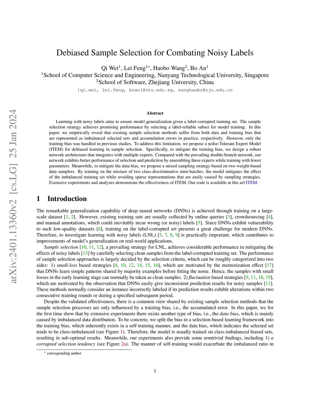 Learning with noisy labels aims to ensure model generalization given a label-corrupted training set. The sample selection strategy achieves promising performance by selecting a label-reliable subset for model training. In this paper, we empirically reveal that existing sample selection methods suffer from both data and training bias that are represented as imbalanced selected sets and accumulation errors in practice, respectively. However, only the training bias was handled in previous studies. To address this limitation, we propose a noIse-Tolerant Expert Model (ITEM) for debiased learning in sample selection. Specifically, to mitigate the training bias, we design a robust network architecture that integrates with multiple experts. Compared with the prevailing double-branch network, our network exhibits better performance of selection and prediction by ensembling these experts while training with fewer parameters. Meanwhile, to mitigate the data bias, we propose a mixed sampling strategy based on two weight-based data samplers. By training on the mixture of two class-discriminative mini-batches, the model mitigates the effect of the imbalanced training set while avoiding sparse representations that are easily caused by sampling strategies. Extensive experiments and analyses demonstrate the effectiveness of ITEM. Our code is available at this url \href{https://github.com/1998v7/ITEM}{ITEM}.
