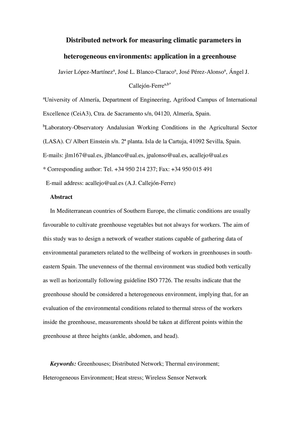 In Mediterranean countries of Southern Europe, the climatic conditions are usually favourable to cultivate greenhouse vegetables but not always for workers. The aim of this study was to design a network of weather stations capable of gathering data of environmental parameters related to the wellbeing of workers in greenhouses in south-eastern Spain. The unevenness of the thermal environment was studied both vertically as well as horizontally following guideline ISO 7726. The results indicate that the greenhouse should be considered a heterogeneous environment, implying that, for an evaluation of the environmental conditions related to thermal stress of the workers inside the greenhouse, measurements should be taken at different points within the greenhouse at three heights (ankle, abdomen, and head).