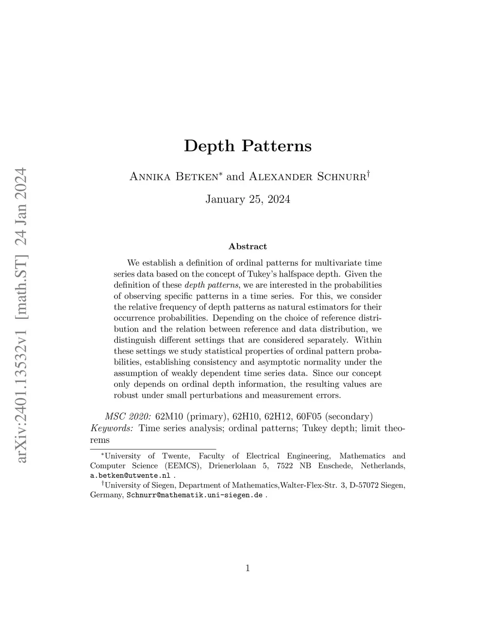 We establish a definition of ordinal patterns for multivariate time series data based on the concept of Tukey's halfspace depth. Given the definition of these \emph{depth patterns}, we are interested in the probabilities of observing specific patterns in a time series. For this, we consider the relative frequency of depth patterns as natural estimators for their occurrence probabilities. Depending on the choice of reference distribution and the relation between reference and data distribution, we distinguish different settings that are considered separately. Within these settings we study statistical properties of ordinal pattern probabilities, establishing consistency and asymptotic normality under the assumption of weakly dependent time series data. Since our concept only depends on ordinal depth information, the resulting values are robust under small perturbations and measurement errors.