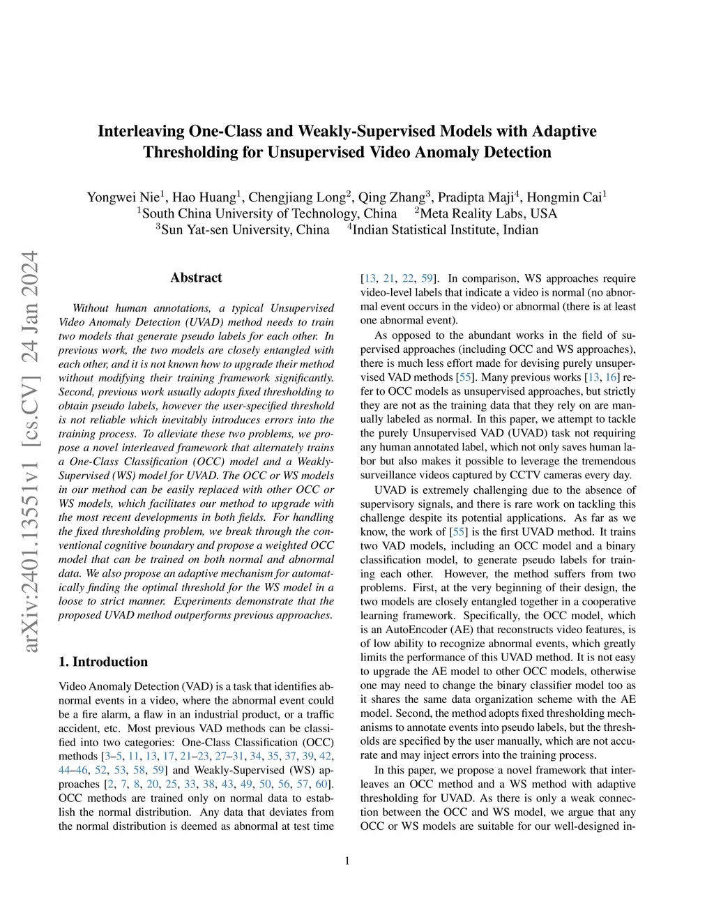 Without human annotations, a typical Unsupervised Video Anomaly Detection (UVAD) method needs to train two models that generate pseudo labels for each other. In previous work, the two models are closely entangled with each other, and it is not known how to upgrade their method without modifying their training framework significantly. Second, previous work usually adopts fixed thresholding to obtain pseudo labels, however the user-specified threshold is not reliable which inevitably introduces errors into the training process. To alleviate these two problems, we propose a novel interleaved framework that alternately trains a One-Class Classification (OCC) model and a Weakly-Supervised (WS) model for UVAD. The OCC or WS models in our method can be easily replaced with other OCC or WS models, which facilitates our method to upgrade with the most recent developments in both fields. For handling the fixed thresholding problem, we break through the conventional cognitive boundary and propose a weighted OCC model that can be trained on both normal and abnormal data. We also propose an adaptive mechanism for automatically finding the optimal threshold for the WS model in a loose to strict manner. Experiments demonstrate that the proposed UVAD method outperforms previous approaches.