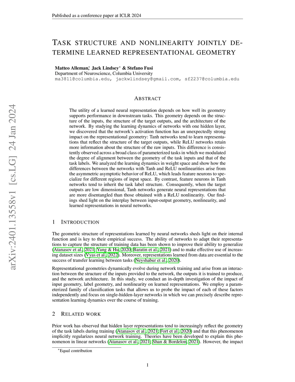 The utility of a learned neural representation depends on how well its geometry supports performance in downstream tasks. This geometry depends on the structure of the inputs, the structure of the target outputs, and the architecture of the network. By studying the learning dynamics of networks with one hidden layer, we discovered that the network's activation function has an unexpectedly strong impact on the representational geometry: Tanh networks tend to learn representations that reflect the structure of the target outputs, while ReLU networks retain more information about the structure of the raw inputs. This difference is consistently observed across a broad class of parameterized tasks in which we modulated the degree of alignment between the geometry of the task inputs and that of the task labels. We analyzed the learning dynamics in weight space and show how the differences between the networks with Tanh and ReLU nonlinearities arise from the asymmetric asymptotic behavior of ReLU, which leads feature neurons to specialize for different regions of input space. By contrast, feature neurons in Tanh networks tend to inherit the task label structure. Consequently, when the target outputs are low dimensional, Tanh networks generate neural representations that are more disentangled than those obtained with a ReLU nonlinearity. Our findings shed light on the interplay between input-output geometry, nonlinearity, and learned representations in neural networks.