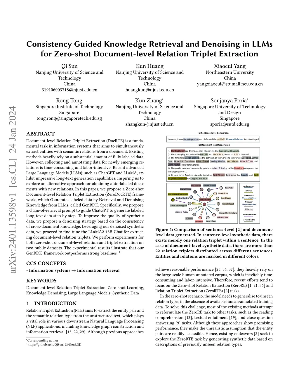 Document-level Relation Triplet Extraction (DocRTE) is a fundamental task in information systems that aims to simultaneously extract entities with semantic relations from a document. Existing methods heavily rely on a substantial amount of fully labeled data. However, collecting and annotating data for newly emerging relations is time-consuming and labor-intensive. Recent advanced Large Language Models (LLMs), such as ChatGPT and LLaMA, exhibit impressive long-text generation capabilities, inspiring us to explore an alternative approach for obtaining auto-labeled documents with new relations. In this paper, we propose a Zero-shot Document-level Relation Triplet Extraction (ZeroDocRTE) framework, which generates labeled data by retrieval and denoising knowledge from LLMs, called GenRDK. Specifically, we propose a chain-of-retrieval prompt to guide ChatGPT to generate labeled long-text data step by step. To improve the quality of synthetic data, we propose a denoising strategy based on the consistency of cross-document knowledge. Leveraging our denoised synthetic data, we proceed to fine-tune the LLaMA2-13B-Chat for extracting document-level relation triplets. We perform experiments for both zero-shot document-level relation and triplet extraction on two public datasets. The experimental results illustrate that our GenRDK framework outperforms strong baselines.
