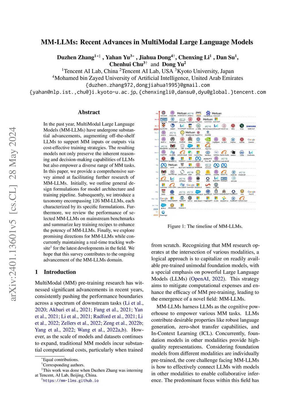 In the past year, MultiModal Large Language Models (MM-LLMs) have undergone substantial advancements, augmenting off-the-shelf LLMs to support MM inputs or outputs via cost-effective training strategies. The resulting models not only preserve the inherent reasoning and decision-making capabilities of LLMs but also empower a diverse range of MM tasks. In this paper, we provide a comprehensive survey aimed at facilitating further research of MM-LLMs. Initially, we outline general design formulations for model architecture and training pipeline. Subsequently, we introduce a taxonomy encompassing 126 MM-LLMs, each characterized by its specific formulations. Furthermore, we review the performance of selected MM-LLMs on mainstream benchmarks and summarize key training recipes to enhance the potency of MM-LLMs. Finally, we explore promising directions for MM-LLMs while concurrently maintaining a real-time tracking website for the latest developments in the field. We hope that this survey contributes to the ongoing advancement of the MM-LLMs domain.