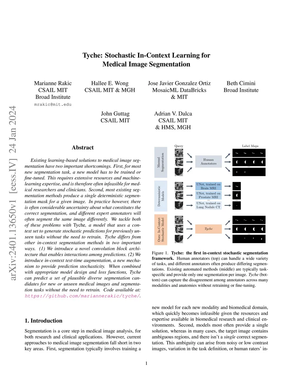 Existing learning-based solutions to medical image segmentation have two important shortcomings. First, for most new segmentation task, a new model has to be trained or fine-tuned. This requires extensive resources and machine learning expertise, and is therefore often infeasible for medical researchers and clinicians. Second, most existing segmentation methods produce a single deterministic segmentation mask for a given image. In practice however, there is often considerable uncertainty about what constitutes the correct segmentation, and different expert annotators will often segment the same image differently. We tackle both of these problems with Tyche, a model that uses a context set to generate stochastic predictions for previously unseen tasks without the need to retrain. Tyche differs from other in-context segmentation methods in two important ways. (1) We introduce a novel convolution block architecture that enables interactions among predictions. (2) We introduce in-context test-time augmentation, a new mechanism to provide prediction stochasticity. When combined with appropriate model design and loss functions, Tyche can predict a set of plausible diverse segmentation candidates for new or unseen medical images and segmentation tasks without the need to retrain.