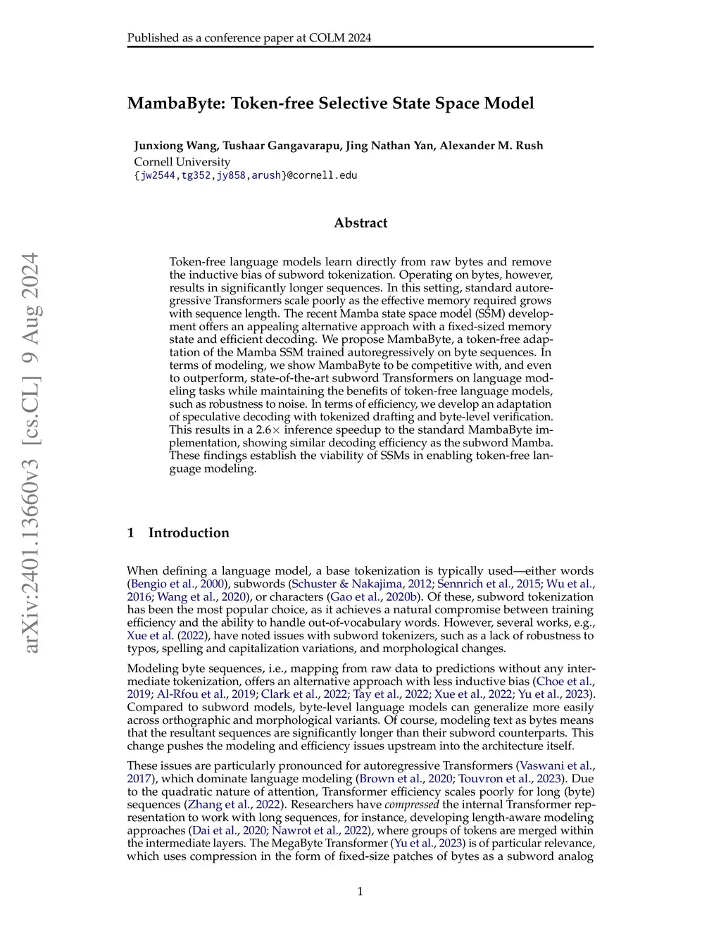 Token-free language models learn directly from raw bytes and remove the inductive bias of subword tokenization. Operating on bytes, however, results in significantly longer sequences. In this setting, standard autoregressive Transformers scale poorly as the effective memory required grows with sequence length. The recent development of the Mamba state space model (SSM) offers an appealing alternative approach with a fixed-sized memory state and efficient decoding. We propose MambaByte, a token-free adaptation of the Mamba SSM trained autoregressively on byte sequences. In terms of modeling, we show MambaByte to be competitive with, and even to outperform, state-of-the-art subword Transformers on language modeling tasks while maintaining the benefits of token-free language models, such as robustness to noise. In terms of efficiency, we develop an adaptation of speculative decoding with tokenized drafting and byte-level verification. This results in a inference speedup to the standard MambaByte implementation, showing similar decoding efficiency as the subword Mamba. These findings establish the viability of SSMs in enabling token-free language modeling.