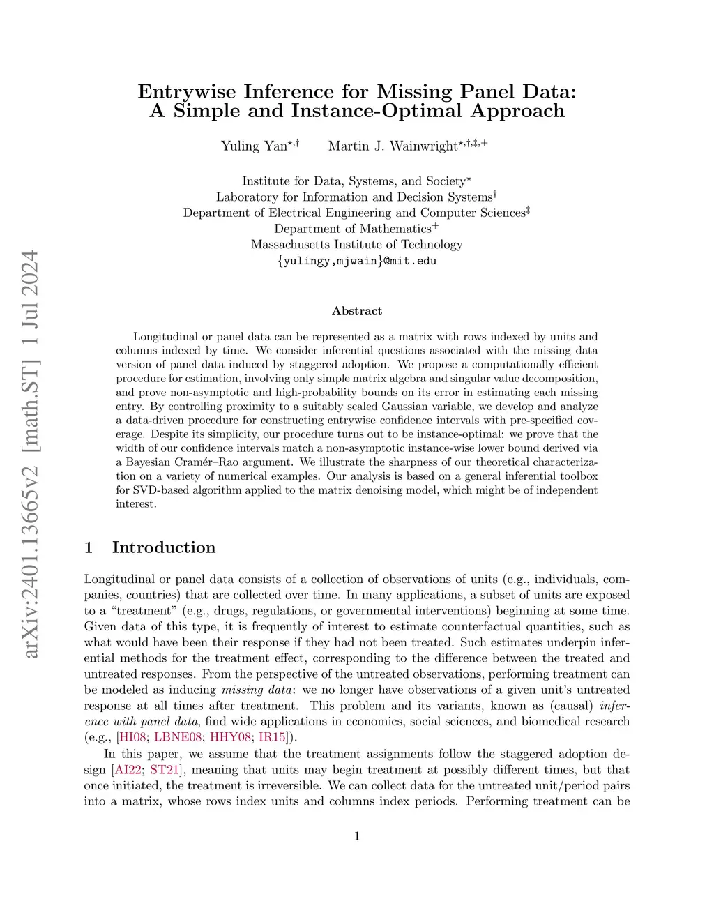 In causal inference with panel data under staggered adoption, the goal is to estimate and derive confidence intervals for potential outcomes and treatment effects. We propose a computationally efficient procedure, involving only simple matrix algebra and singular value decomposition. We derive non-asymptotic bounds on the entrywise error, establishing its proximity to a suitably scaled Gaussian variable. Despite its simplicity, our procedure turns out to be instance-optimal, in that our theoretical scaling matches a local instance-wise lower bound derived via a Bayesian Cram\'{e}r-Rao argument. Using our insights, we develop a data-driven procedure for constructing entrywise confidence intervals with pre-specified coverage guarantees. Our analysis is based on a general inferential toolbox for the SVD algorithm applied to the matrix denoising model, which might be of independent interest.