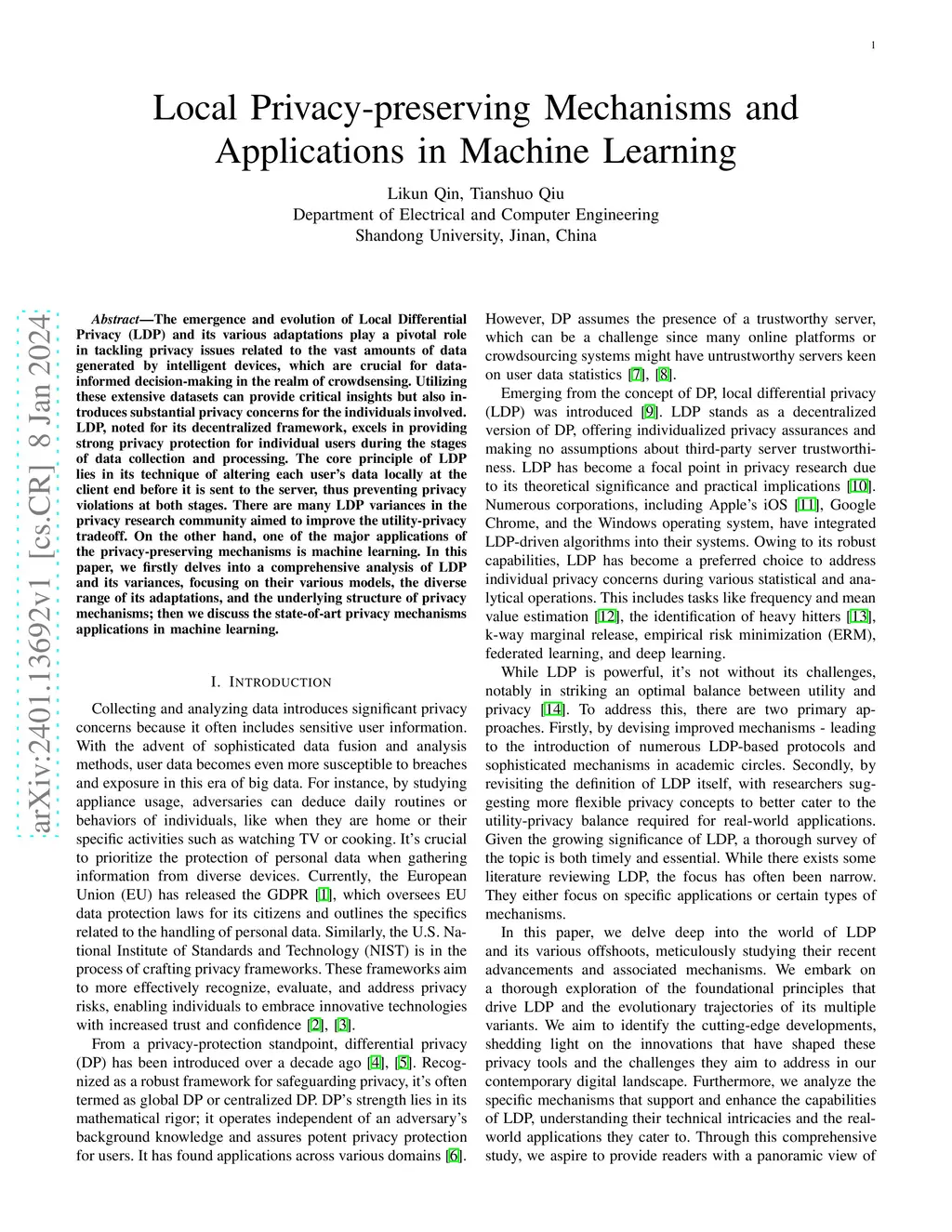 The emergence and evolution of Local Differential Privacy (LDP) and its various adaptations play a pivotal role in tackling privacy issues related to the vast amounts of data generated by intelligent devices, which are crucial for data-informed decision-making in the realm of crowdsensing. Utilizing these extensive datasets can provide critical insights but also introduces substantial privacy concerns for the individuals involved. LDP, noted for its decentralized framework, excels in providing strong privacy protection for individual users during the stages of data collection and processing. The core principle of LDP lies in its technique of altering each user's data locally at the client end before it is sent to the server, thus preventing privacy violations at both stages. There are many LDP variances in the privacy research community aimed to improve the utility-privacy tradeoff. On the other hand, one of the major applications of the privacy-preserving mechanisms is machine learning. In this paper, we firstly delves into a comprehensive analysis of LDP and its variances, focusing on their various models, the diverse range of its adaptations, and the underlying structure of privacy mechanisms; then we discuss the state-of-art privacy mechanisms applications in machine learning.