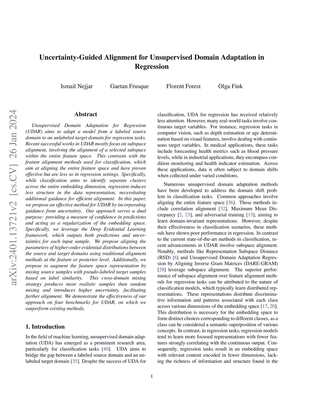 Unsupervised Domain Adaptation for Regression (UDAR) aims to adapt a model from a labeled source domain to an unlabeled target domain for regression tasks. Recent successful works in UDAR mostly focus on subspace alignment, involving the alignment of a selected subspace within the entire feature space. This contrasts with the feature alignment methods used for classification, which aim at aligning the entire feature space and have proven effective but are less so in regression settings. Specifically, while classification aims to identify separate clusters across the entire embedding dimension, regression induces less structure in the data representation, necessitating additional guidance for efficient alignment. In this paper, we propose an effective method for UDAR by incorporating guidance from uncertainty. Our approach serves a dual purpose: providing a measure of confidence in predictions and acting as a regularization of the embedding space. Specifically, we leverage the Deep Evidential Learning framework, which outputs both predictions and uncertainties for each input sample. We propose aligning the parameters of higher-order evidential distributions between the source and target domains using traditional alignment methods at the feature or posterior level. Additionally, we propose to augment the feature space representation by mixing source samples with pseudo-labeled target samples based on label similarity. This cross-domain mixing strategy produces more realistic samples than random mixing and introduces higher uncertainty, facilitating further alignment. We demonstrate the effectiveness of our approach on four benchmarks for UDAR, on which we outperform existing methods.