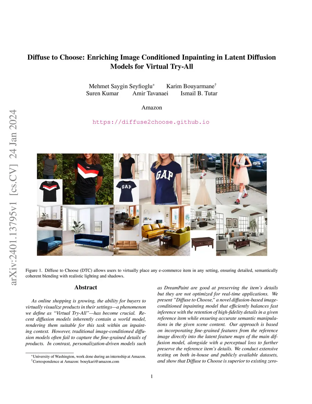 As online shopping is growing, the ability for buyers to virtually visualize products in their settings-a phenomenon we define as "Virtual Try-All"-has become crucial. Recent diffusion models inherently contain a world model, rendering them suitable for this task within an inpainting context. However, traditional image-conditioned diffusion models often fail to capture the fine-grained details of products. In contrast, personalization-driven models such as DreamPaint are good at preserving the item's details but they are not optimized for real-time applications. We present "Diffuse to Choose," a novel diffusion-based image-conditioned inpainting model that efficiently balances fast inference with the retention of high-fidelity details in a given reference item while ensuring accurate semantic manipulations in the given scene content. Our approach is based on incorporating fine-grained features from the reference image directly into the latent feature maps of the main diffusion model, alongside with a perceptual loss to further preserve the reference item's details. We conduct extensive testing on both in-house and publicly available datasets, and show that Diffuse to Choose is superior to existing zero-shot diffusion inpainting methods as well as few-shot diffusion personalization algorithms like DreamPaint.