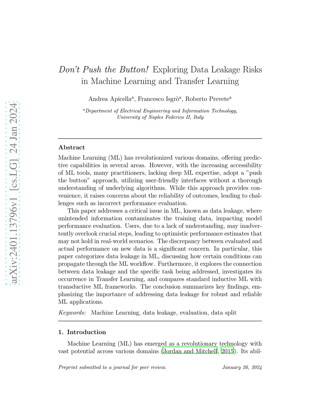 Machine Learning (ML) has revolutionized various domains, offering predictive capabilities in several areas. However, with the increasing accessibility of ML tools, many practitioners, lacking deep ML expertise, adopt a "push the button" approach, utilizing user-friendly interfaces without a thorough understanding of underlying algorithms. While this approach provides convenience, it raises concerns about the reliability of outcomes, leading to challenges such as incorrect performance evaluation. This paper addresses a critical issue in ML, known as data leakage, where unintended information contaminates the training data, impacting model performance evaluation. Users, due to a lack of understanding, may inadvertently overlook crucial steps, leading to optimistic performance estimates that may not hold in real-world scenarios. The discrepancy between evaluated and actual performance on new data is a significant concern. In particular, this paper categorizes data leakage in ML, discussing how certain conditions can propagate through the ML workflow. Furthermore, it explores the connection between data leakage and the specific task being addressed, investigates its occurrence in Transfer Learning, and compares standard inductive ML with transductive ML frameworks. The conclusion summarizes key findings, emphasizing the importance of addressing data leakage for robust and reliable ML applications.