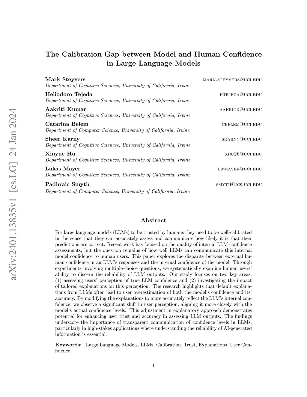 As artificial intelligence (AI) systems, particularly large language models (LLMs), become increasingly integrated into decision-making processes, the ability to trust their outputs is crucial. To earn human trust, LLMs must be well calibrated such that they can accurately assess and communicate the likelihood of their predictions being correct. Whereas recent work has focused on LLMs' internal confidence, less is understood about how effectively they convey uncertainty to users. Here we explore the calibration gap, which refers to the difference between human confidence in LLM-generated answers and the models' actual confidence, and the discrimination gap, which reflects how well humans and models can distinguish between correct and incorrect answers. Our experiments with multiple-choice and short-answer questions reveal that users tend to overestimate the accuracy of LLM responses when provided with default explanations. Moreover, longer explanations increased user confidence, even when the extra length did not improve answer accuracy. By adjusting LLM explanations to better reflect the models' internal confidence, both the calibration gap and the discrimination gap narrowed, significantly improving user perception of LLM accuracy. These findings underscore the importance of accurate uncertainty communication and highlight the effect of explanation length in influencing user trust in AI-assisted decision-making environments. Code and Data can be found atthis https URL. Journal publication can be found on Nature Machine Intelligence atthis https URL.