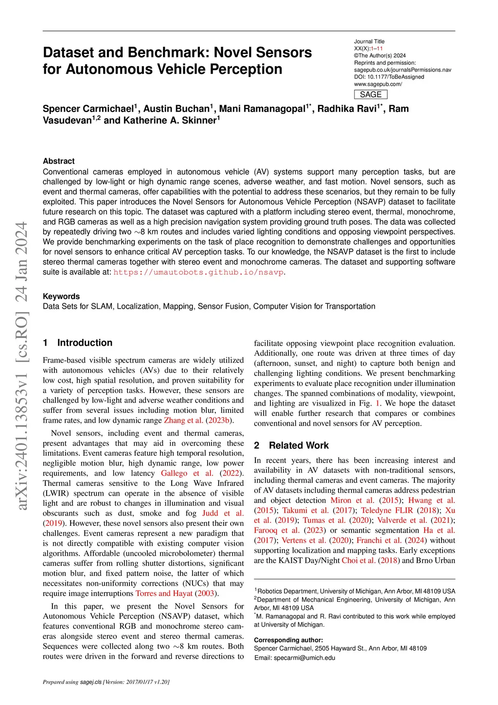 Conventional cameras employed in autonomous vehicle (AV) systems support many perception tasks, but are challenged by low-light or high dynamic range scenes, adverse weather, and fast motion. Novel sensors, such as event and thermal cameras, offer capabilities with the potential to address these scenarios, but they remain to be fully exploited. This paper introduces the Novel Sensors for Autonomous Vehicle Perception (NSAVP) dataset to facilitate future research on this topic. The dataset was captured with a platform including stereo event, thermal, monochrome, and RGB cameras as well as a high precision navigation system providing ground truth poses. The data was collected by repeatedly driving two ~8 km routes and includes varied lighting conditions and opposing viewpoint perspectives. We provide benchmarking experiments on the task of place recognition to demonstrate challenges and opportunities for novel sensors to enhance critical AV perception tasks. To our knowledge, the NSAVP dataset is the first to include stereo thermal cameras together with stereo event and monochrome cameras. The dataset and supporting software suite is available at: https://umautobots.github.io/nsavp