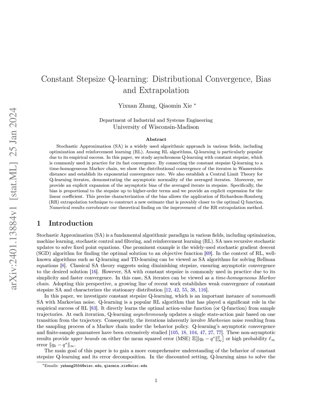 Stochastic Approximation (SA) is a widely used algorithmic approach in various fields, including optimization and reinforcement learning (RL). Among RL algorithms, Q-learning is particularly popular due to its empirical success. In this paper, we study asynchronous Q-learning with constant stepsize, which is commonly used in practice for its fast convergence. By connecting the constant stepsize Q-learning to a time-homogeneous Markov chain, we show the distributional convergence of the iterates in Wasserstein distance and establish its exponential convergence rate. We also establish a Central Limit Theory for Q-learning iterates, demonstrating the asymptotic normality of the averaged iterates. Moreover, we provide an explicit expansion of the asymptotic bias of the averaged iterate in stepsize. Specifically, the bias is proportional to the stepsize up to higher-order terms and we provide an explicit expression for the linear coefficient. This precise characterization of the bias allows the application of Richardson-Romberg (RR) extrapolation technique to construct a new estimate that is provably closer to the optimal Q function. Numerical results corroborate our theoretical finding on the improvement of the RR extrapolation method.