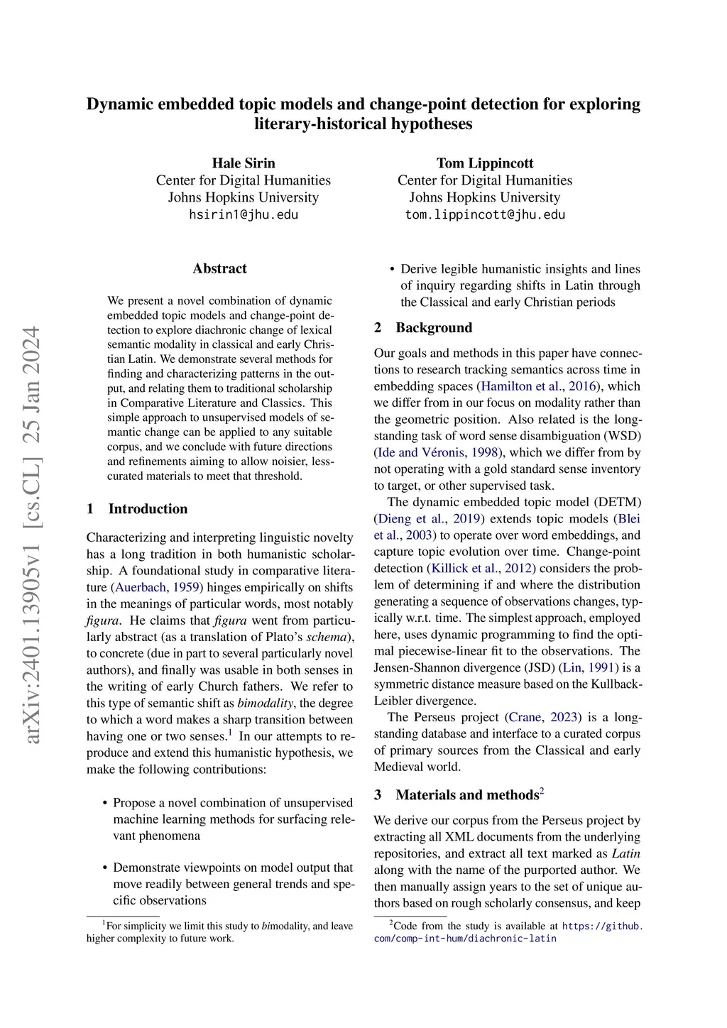 We present a novel combination of dynamic embedded topic models and change-point detection to explore diachronic change of lexical semantic modality in classical and early Christian Latin. We demonstrate several methods for finding and characterizing patterns in the output, and relating them to traditional scholarship in Comparative Literature and Classics. This simple approach to unsupervised models of semantic change can be applied to any suitable corpus, and we conclude with future directions and refinements aiming to allow noisier, less-curated materials to meet that threshold.