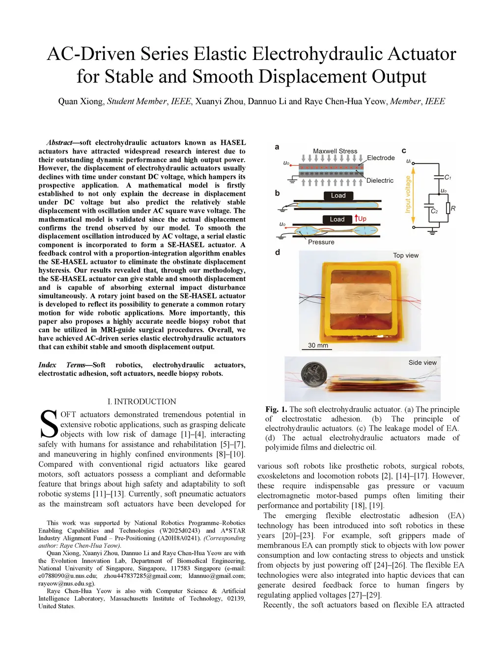 Soft electrohydraulic actuators known as HASEL actuators have attracted widespread research interest due to their outstanding dynamic performance and high output power. However, the displacement of electrohydraulic actuators usually declines with time under constant DC voltage, which hampers its prospective application. A mathematical model is firstly established to not only explain the decrease in displacement under DC voltage but also predict the relatively stable displacement with oscillation under AC square wave voltage. The mathematical model is validated since the actual displacement confirms the trend observed by our model. To smooth the displacement oscillation introduced by AC voltage, a serial elastic component is incorporated to form a SE-HASEL actuator. A feedback control with a proportion-integration algorithm enables the SE-HASEL actuator to eliminate the obstinate displacement hysteresis. Our results revealed that, through our methodology, the SE-HASEL actuator can give stable and smooth displacement and is capable of absorbing external impact disturbance simultaneously. A rotary joint based on the SE-HASEL actuator is developed to reflect its possibility to generate a common rotary motion for wide robotic applications. More importantly, this paper also proposes a highly accurate needle biopsy robot that can be utilized in MRI-guide surgical procedures. Overall, we have achieved AC-driven series elastic electrohydraulic actuators that can exhibit stable and smooth displacement output.