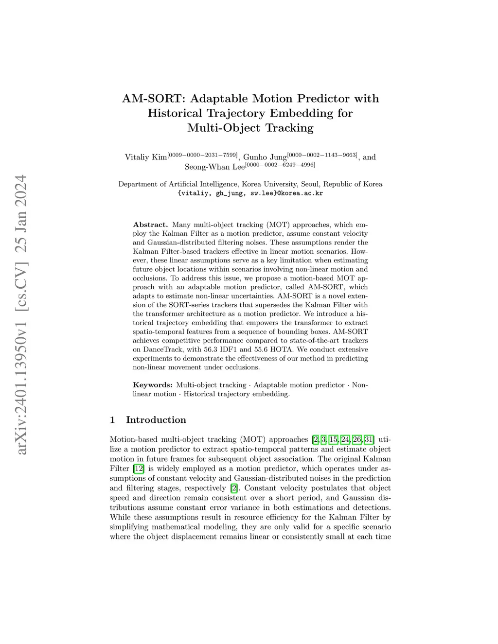 Many multi-object tracking (MOT) approaches, which employ the Kalman Filter as a motion predictor, assume constant velocity and Gaussian-distributed filtering noises. These assumptions render the Kalman Filter-based trackers effective in linear motion scenarios. However, these linear assumptions serve as a key limitation when estimating future object locations within scenarios involving non-linear motion and occlusions. To address this issue, we propose a motion-based MOT approach with an adaptable motion predictor, called AM-SORT, which adapts to estimate non-linear uncertainties. AM-SORT is a novel extension of the SORT-series trackers that supersedes the Kalman Filter with the transformer architecture as a motion predictor. We introduce a historical trajectory embedding that empowers the transformer to extract spatio-temporal features from a sequence of bounding boxes. AM-SORT achieves competitive performance compared to state-of-the-art trackers on DanceTrack, with 56.3 IDF1 and 55.6 HOTA. We conduct extensive experiments to demonstrate the effectiveness of our method in predicting non-linear movement under occlusions.