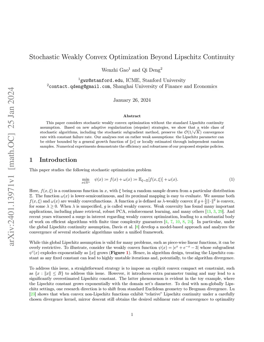 This paper considers stochastic weakly convex optimization without the standard Lipschitz continuity assumption. Based on new adaptive regularization (stepsize) strategies, we show that a wide class of stochastic algorithms, including the stochastic subgradient method, preserve the convergence rate with constant failure rate. Our analyses rest on rather weak assumptions: the Lipschitz parameter can be either bounded by a general growth function of or locally estimated through independent random samples.