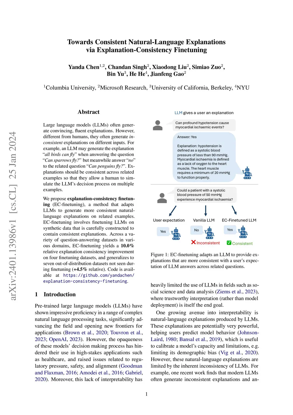Large language models (LLMs) often generate convincing, fluent explanations. However, different from humans, they often generate inconsistent explanations on different inputs. For example, an LLM may generate the explanation "all birds can fly" when answering the question "Can sparrows fly?" but meanwhile answer "no" to the related question "Can penguins fly?". Explanations should be consistent across related examples so that they allow a human to simulate the LLM's decision process on multiple examples. We propose explanation-consistency finetuning (EC-finetuning), a method that adapts LLMs to generate more consistent natural-language explanations on related examples. EC-finetuning involves finetuning LLMs on synthetic data that is carefully constructed to contain consistent explanations. Across a variety of question-answering datasets in various domains, EC-finetuning yields a 10.0% relative explanation consistency improvement on four finetuning datasets, and generalizes to seven out-of-distribution datasets not seen during finetuning (+4.5% relative). Code is available at https://github.com/yandachen/explanation-consistency-finetuning .