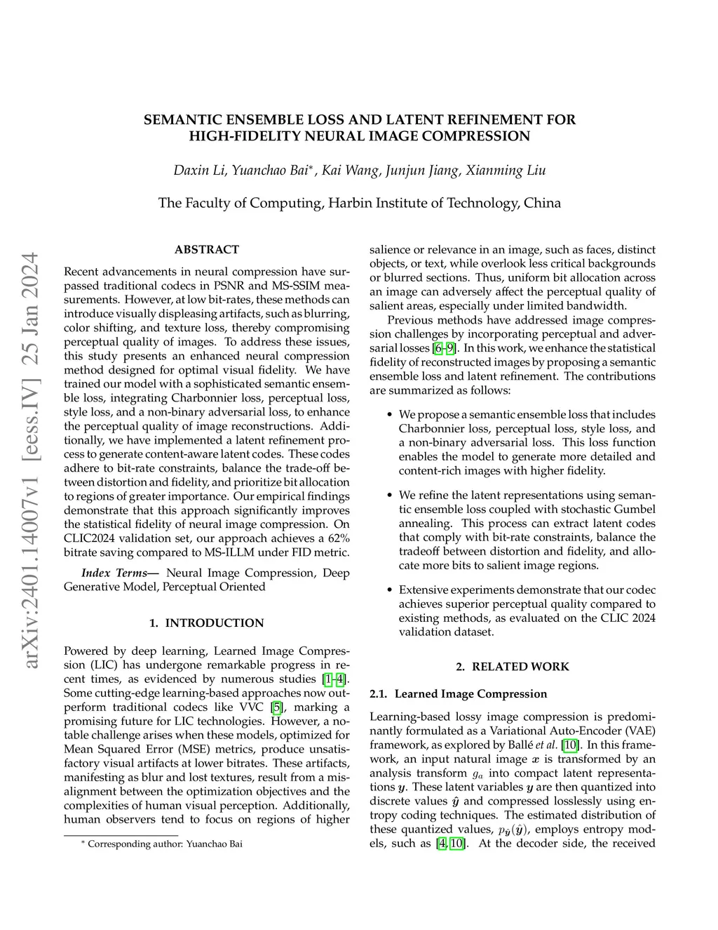 Recent advancements in neural compression have surpassed traditional codecs in PSNR and MS-SSIM measurements. However, at low bit-rates, these methods can introduce visually displeasing artifacts, such as blurring, color shifting, and texture loss, thereby compromising perceptual quality of images. To address these issues, this study presents an enhanced neural compression method designed for optimal visual fidelity. We have trained our model with a sophisticated semantic ensemble loss, integrating Charbonnier loss, perceptual loss, style loss, and a non-binary adversarial loss, to enhance the perceptual quality of image reconstructions. Additionally, we have implemented a latent refinement process to generate content-aware latent codes. These codes adhere to bit-rate constraints, balance the trade-off between distortion and fidelity, and prioritize bit allocation to regions of greater importance. Our empirical findings demonstrate that this approach significantly improves the statistical fidelity of neural image compression. On CLIC2024 validation set, our approach achieves a 62% bitrate saving compared to MS-ILLM under FID metric.