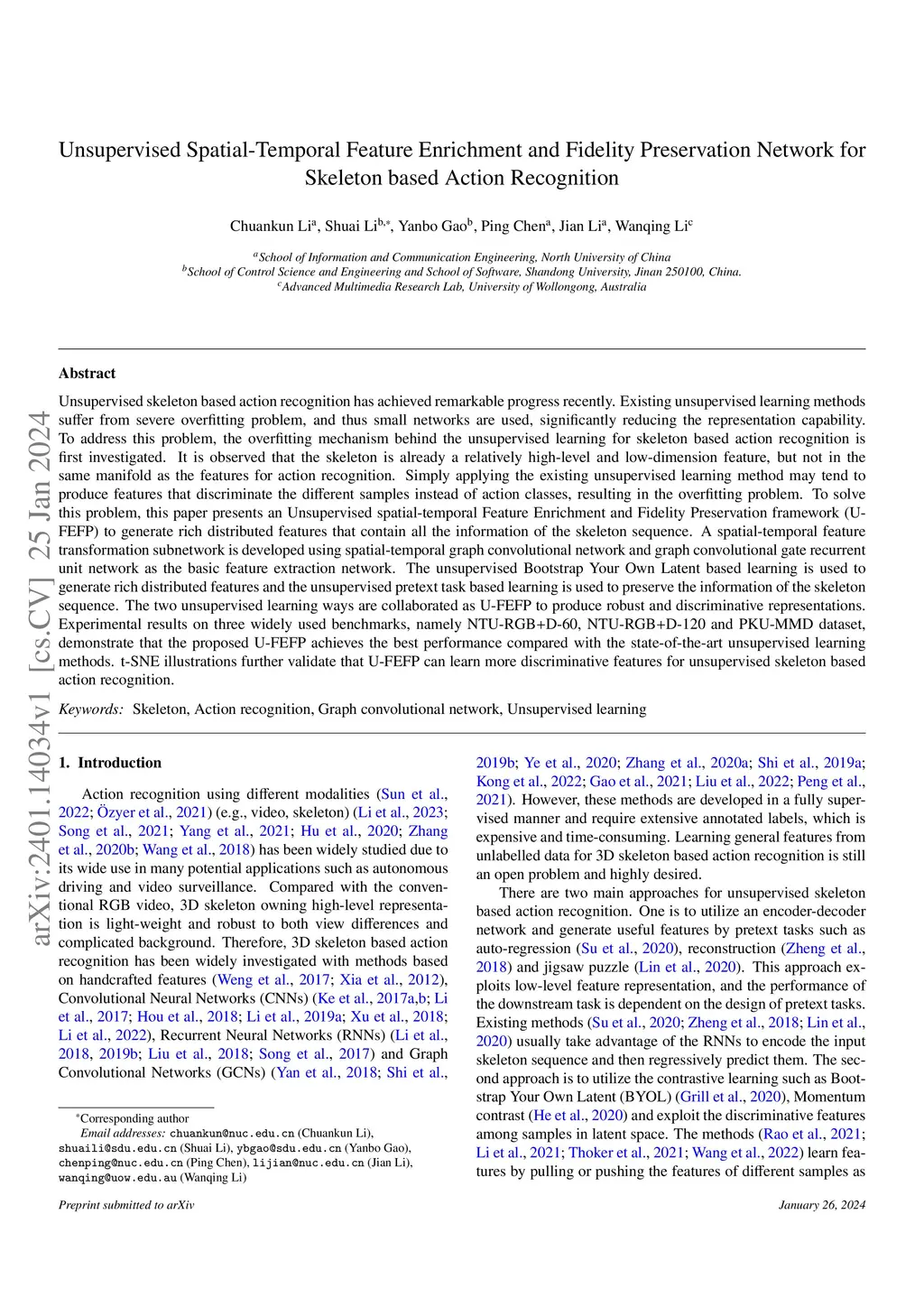 Unsupervised skeleton based action recognition has achieved remarkable progress recently. Existing unsupervised learning methods suffer from severe overfitting problem, and thus small networks are used, significantly reducing the representation capability. To address this problem, the overfitting mechanism behind the unsupervised learning for skeleton based action recognition is first investigated. It is observed that the skeleton is already a relatively high-level and low-dimension feature, but not in the same manifold as the features for action recognition. Simply applying the existing unsupervised learning method may tend to produce features that discriminate the different samples instead of action classes, resulting in the overfitting problem. To solve this problem, this paper presents an Unsupervised spatial-temporal Feature Enrichment and Fidelity Preservation framework (U-FEFP) to generate rich distributed features that contain all the information of the skeleton sequence. A spatial-temporal feature transformation subnetwork is developed using spatial-temporal graph convolutional network and graph convolutional gate recurrent unit network as the basic feature extraction network. The unsupervised Bootstrap Your Own Latent based learning is used to generate rich distributed features and the unsupervised pretext task based learning is used to preserve the information of the skeleton sequence. The two unsupervised learning ways are collaborated as U-FEFP to produce robust and discriminative representations. Experimental results on three widely used benchmarks, namely NTU-RGB+D-60, NTU-RGB+D-120 and PKU-MMD dataset, demonstrate that the proposed U-FEFP achieves the best performance compared with the state-of-the-art unsupervised learning methods. t-SNE illustrations further validate that U-FEFP can learn more discriminative features for unsupervised skeleton based action recognition.