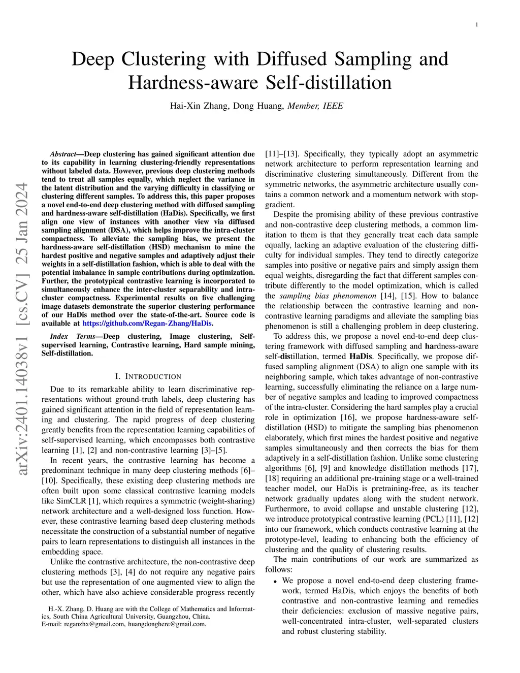Deep clustering has gained significant attention due to its capability in learning clustering-friendly representations without labeled data. However, previous deep clustering methods tend to treat all samples equally, which neglect the variance in the latent distribution and the varying difficulty in classifying or clustering different samples. To address this, this paper proposes a novel end-to-end deep clustering method with diffused sampling and hardness-aware self-distillation (HaDis). Specifically, we first align one view of instances with another view via diffused sampling alignment (DSA), which helps improve the intra-cluster compactness. To alleviate the sampling bias, we present the hardness-aware self-distillation (HSD) mechanism to mine the hardest positive and negative samples and adaptively adjust their weights in a self-distillation fashion, which is able to deal with the potential imbalance in sample contributions during optimization. Further, the prototypical contrastive learning is incorporated to simultaneously enhance the inter-cluster separability and intra-cluster compactness. Experimental results on five challenging image datasets demonstrate the superior clustering performance of our HaDis method over the state-of-the-art. Source code is available at https://github.com/Regan-Zhang/HaDis.