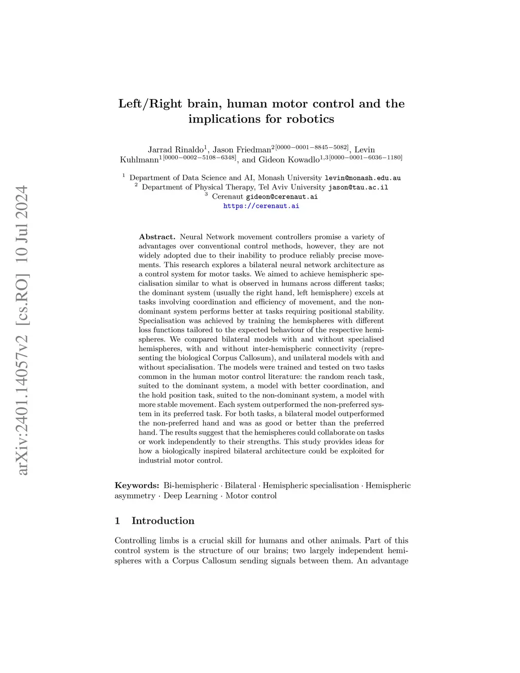 Neural Network movement controllers promise a variety of advantages over conventional control methods, however, they are not widely adopted due to their inability to produce reliably precise movements. This research explores a bilateral neural network architecture as a control system for motor tasks. We aimed to achieve hemispheric specialisation similar to what is observed in humans across different tasks; the dominant system (usually the right hand, left hemisphere) excels at tasks involving coordination and efficiency of movement, and the non-dominant system performs better at tasks requiring positional stability. Specialisation was achieved by training the hemispheres with different loss functions tailored to the expected behaviour of the respective hemispheres. We compared bilateral models with and without specialised hemispheres, with and without inter-hemispheric connectivity (representing the biological Corpus Callosum), and unilateral models with and without specialisation. The models were trained and tested on two tasks common in the human motor control literature: the random reach task, suited to the dominant system, a model with better coordination, and the hold position task, suited to the non-dominant system, a model with more stable movement. Each system outperformed the non-preferred system in its preferred task. For both tasks, a bilateral model outperformed the non-preferred hand and was as good or better than the preferred hand. The results suggest that the hemispheres could collaborate on tasks or work independently to their strengths. This study provides ideas for how a biologically inspired bilateral architecture could be exploited for industrial motor control.