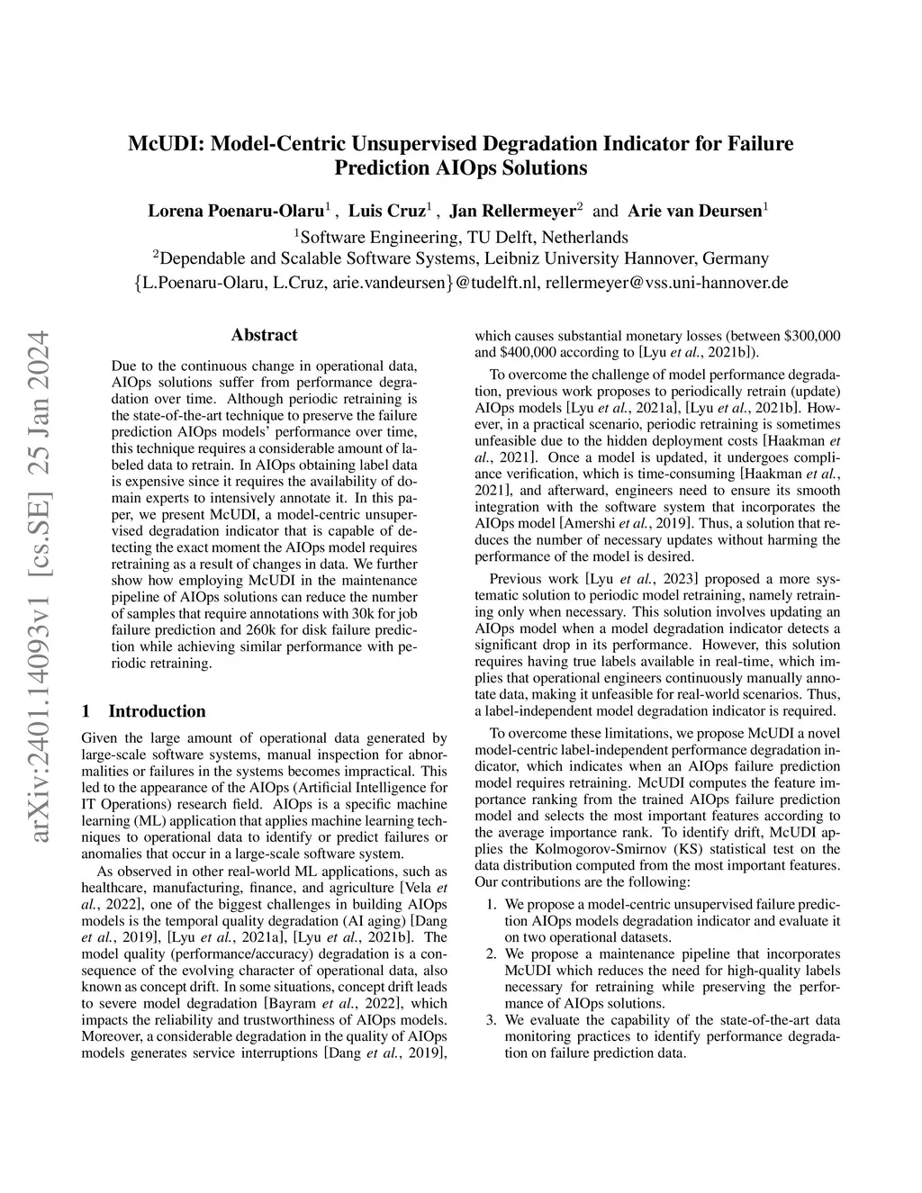 Due to the continuous change in operational data, AIOps solutions suffer from performance degradation over time. Although periodic retraining is the state-of-the-art technique to preserve the failure prediction AIOps models' performance over time, this technique requires a considerable amount of labeled data to retrain. In AIOps obtaining label data is expensive since it requires the availability of domain experts to intensively annotate it. In this paper, we present McUDI, a model-centric unsupervised degradation indicator that is capable of detecting the exact moment the AIOps model requires retraining as a result of changes in data. We further show how employing McUDI in the maintenance pipeline of AIOps solutions can reduce the number of samples that require annotations with 30k for job failure prediction and 260k for disk failure prediction while achieving similar performance with periodic retraining.
