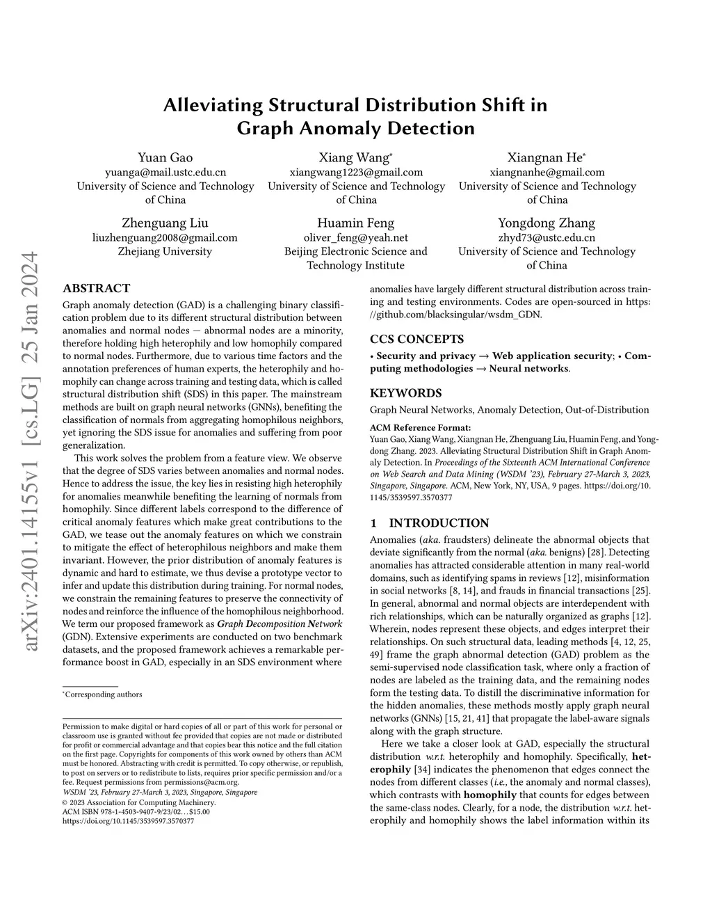 Graph anomaly detection (GAD) is a challenging binary classification problem due to its different structural distribution between anomalies and normal nodes -- abnormal nodes are a minority, therefore holding high heterophily and low homophily compared to normal nodes. Furthermore, due to various time factors and the annotation preferences of human experts, the heterophily and homophily can change across training and testing data, which is called structural distribution shift (SDS) in this paper. The mainstream methods are built on graph neural networks (GNNs), benefiting the classification of normals from aggregating homophilous neighbors, yet ignoring the SDS issue for anomalies and suffering from poor generalization. This work solves the problem from a feature view. We observe that the degree of SDS varies between anomalies and normal nodes. Hence to address the issue, the key lies in resisting high heterophily for anomalies meanwhile benefiting the learning of normals from homophily. We tease out the anomaly features on which we constrain to mitigate the effect of heterophilous neighbors and make them invariant. We term our proposed framework as Graph Decomposition Network (GDN). Extensive experiments are conducted on two benchmark datasets, and the proposed framework achieves a remarkable performance boost in GAD, especially in an SDS environment where anomalies have largely different structural distribution across training and testing environments. Codes are open-sourced in https://github.com/blacksingular/wsdm_GDN.