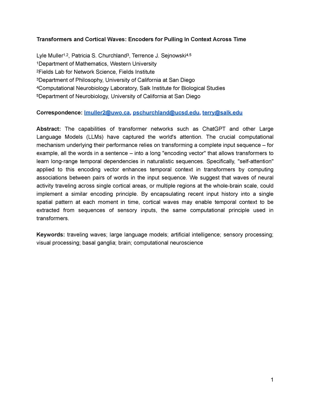 Transformers and Cortical Waves: Encoders for Pulling In Context Across