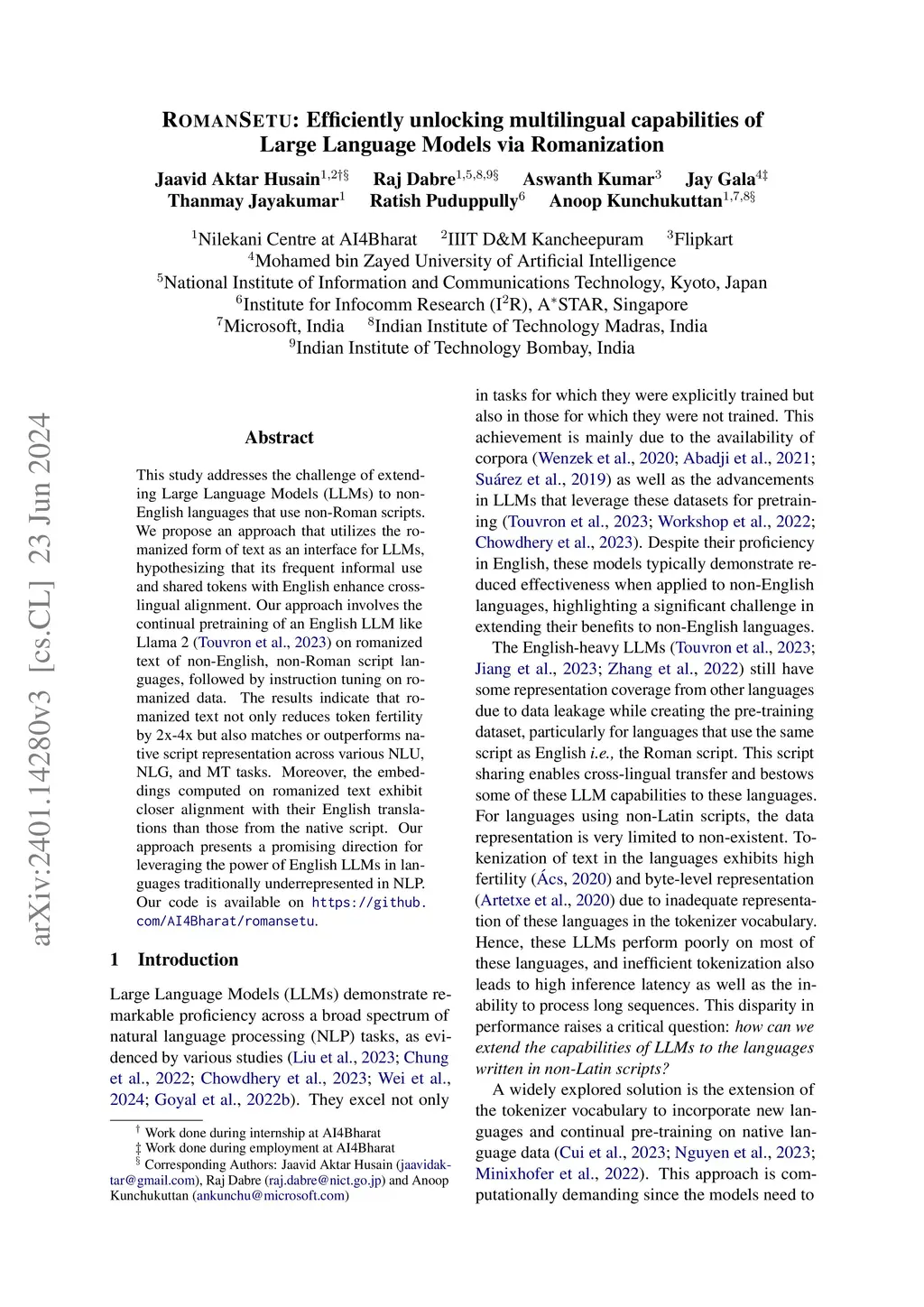 RomanSetu: Efficiently unlocking multilingual capabilities of Large