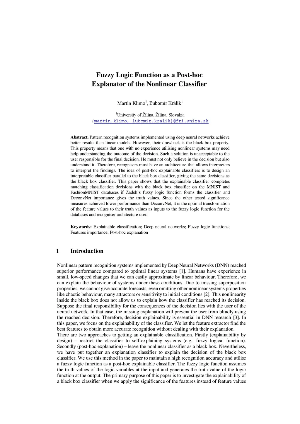 Pattern recognition systems implemented using deep neural networks achieve better results than linear models. However, their drawback is the black box property. This property means that one with no experience utilising nonlinear systems may need help understanding the outcome of the decision. Such a solution is unacceptable to the user responsible for the final decision. He must not only believe in the decision but also understand it. Therefore, recognisers must have an architecture that allows interpreters to interpret the findings. The idea of post-hoc explainable classifiers is to design an interpretable classifier parallel to the black box classifier, giving the same decisions as the black box classifier. This paper shows that the explainable classifier completes matching classification decisions with the black box classifier on the MNIST and FashionMNIST databases if Zadeh`s fuzzy logic function forms the classifier and DeconvNet importance gives the truth values. Since the other tested significance measures achieved lower performance than DeconvNet, it is the optimal transformation of the feature values to their truth values as inputs to the fuzzy logic function for the databases and recogniser architecture used.