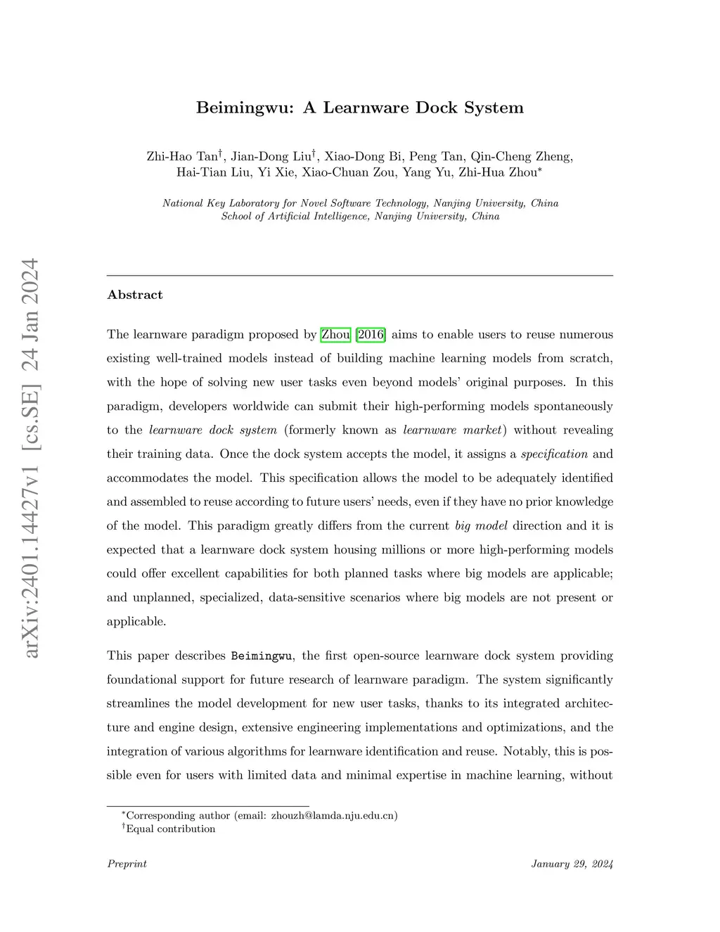 The learnware paradigm proposed by Zhou [2016] aims to enable users to reuse numerous existing well-trained models instead of building machine learning models from scratch, with the hope of solving new user tasks even beyond models' original purposes. In this paradigm, developers worldwide can submit their high-performing models spontaneously to the learnware dock system (formerly known as learnware market) without revealing their training data. Once the dock system accepts the model, it assigns a specification and accommodates the model. This specification allows the model to be adequately identified and assembled to reuse according to future users' needs, even if they have no prior knowledge of the model. This paradigm greatly differs from the current big model direction and it is expected that a learnware dock system housing millions or more high-performing models could offer excellent capabilities for both planned tasks where big models are applicable; and unplanned, specialized, data-sensitive scenarios where big models are not present or applicable. This paper describes Beimingwu, the first open-source learnware dock system providing foundational support for future research of learnware paradigm.The system significantly streamlines the model development for new user tasks, thanks to its integrated architecture and engine design, extensive engineering implementations and optimizations, and the integration of various algorithms for learnware identification and reuse. Notably, this is possible even for users with limited data and minimal expertise in machine learning, without compromising the raw data's security. Beimingwu supports the entire process of learnware paradigm. The system lays the foundation for future research in learnware-related algorithms and systems, and prepares the ground for hosting a vast array of learnwares and establishing a learnware ecosystem.