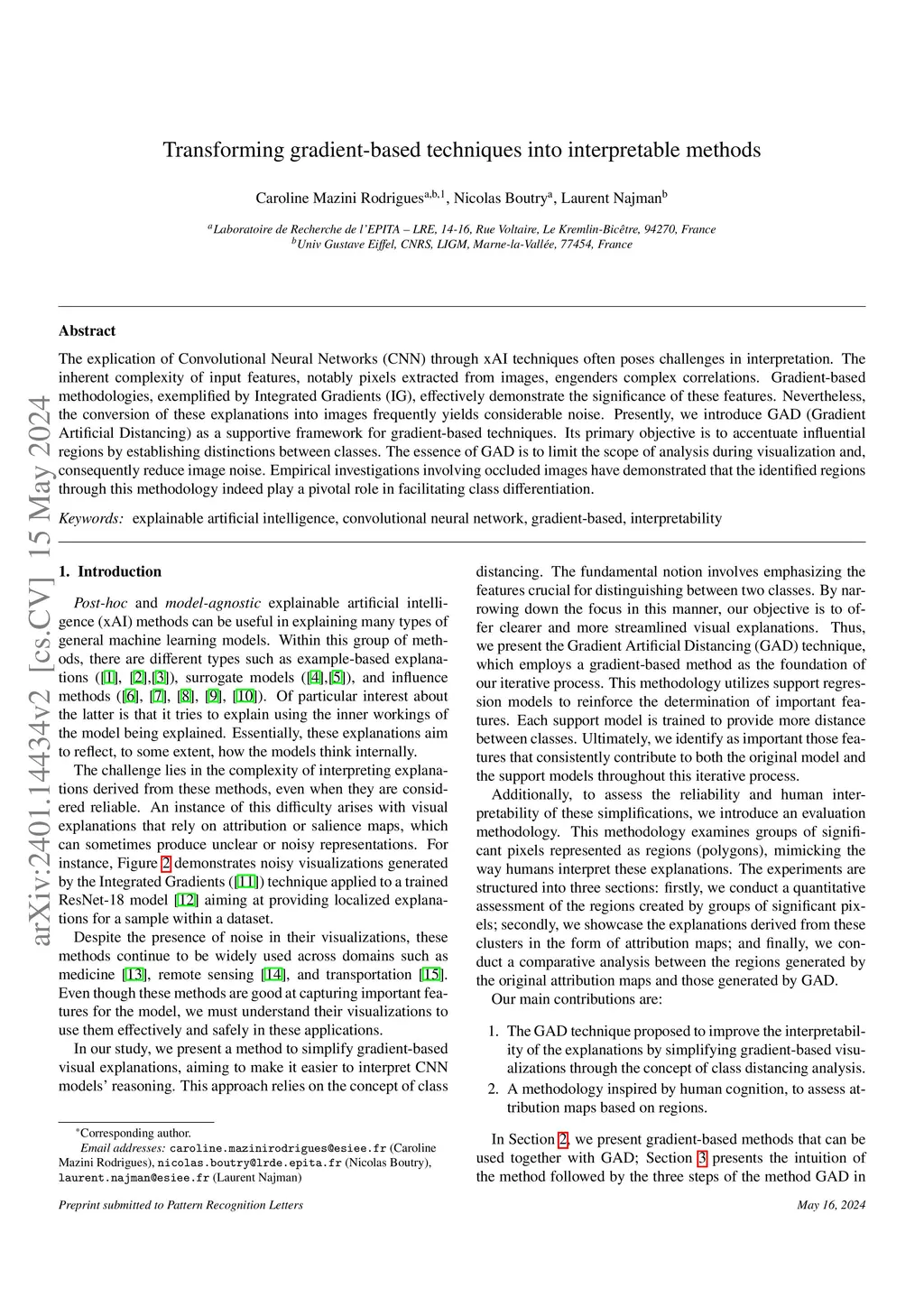 The explication of Convolutional Neural Networks (CNN) through xAI techniques often poses challenges in interpretation. The inherent complexity of input features, notably pixels extracted from images, engenders complex correlations. Gradient-based methodologies, exemplified by Integrated Gradients (IG), effectively demonstrate the significance of these features. Nevertheless, the conversion of these explanations into images frequently yields considerable noise. Presently, we introduce GAD (Gradient Artificial Distancing) as a supportive framework for gradient-based techniques. Its primary objective is to accentuate influential regions by establishing distinctions between classes. The essence of GAD is to limit the scope of analysis during visualization and, consequently reduce image noise. Empirical investigations involving occluded images have demonstrated that the identified regions through this methodology indeed play a pivotal role in facilitating class differentiation.