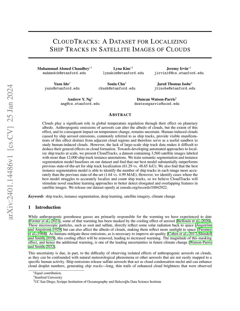 Clouds play a significant role in global temperature regulation through their effect on planetary albedo. Anthropogenic emissions of aerosols can alter the albedo of clouds, but the extent of this effect, and its consequent impact on temperature change, remains uncertain. Human-induced clouds caused by ship aerosol emissions, commonly referred to as ship tracks, provide visible manifestations of this effect distinct from adjacent cloud regions and therefore serve as a useful sandbox to study human-induced clouds. However, the lack of large-scale ship track data makes it difficult to deduce their general effects on cloud formation. Towards developing automated approaches to localize ship tracks at scale, we present CloudTracks, a dataset containing 3,560 satellite images labeled with more than 12,000 ship track instance annotations. We train semantic segmentation and instance segmentation model baselines on our dataset and find that our best model substantially outperforms previous state-of-the-art for ship track localization (61.29 vs. 48.65 IoU). We also find that the best instance segmentation model is able to identify the number of ship tracks in each image more accurately than the previous state-of-the-art (1.64 vs. 4.99 MAE). However, we identify cases where the best model struggles to accurately localize and count ship tracks, so we believe CloudTracks will stimulate novel machine learning approaches to better detect elongated and overlapping features in satellite images. We release our dataset openly at {zenodo.org/records/10042922}.