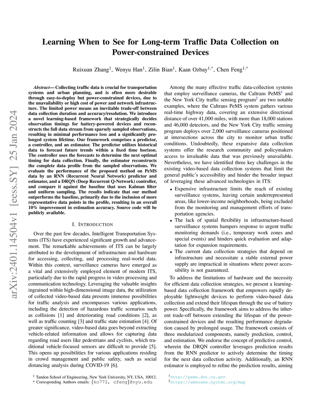 Collecting traffic data is crucial for transportation systems and urban planning, and is often more desirable through easy-to-deploy but power-constrained devices, due to the unavailability or high cost of power and network infrastructure. The limited power means an inevitable trade-off between data collection duration and accuracy/resolution. We introduce a novel learning-based framework that strategically decides observation timings for battery-powered devices and reconstructs the full data stream from sparsely sampled observations, resulting in minimal performance loss and a significantly prolonged system lifetime. Our framework comprises a predictor, a controller, and an estimator. The predictor utilizes historical data to forecast future trends within a fixed time horizon. The controller uses the forecasts to determine the next optimal timing for data collection. Finally, the estimator reconstructs the complete data profile from the sampled observations. We evaluate the performance of the proposed method on PeMS data by an RNN (Recurrent Neural Network) predictor and estimator, and a DRQN (Deep Recurrent Q-Network) controller, and compare it against the baseline that uses Kalman filter and uniform sampling. The results indicate that our method outperforms the baseline, primarily due to the inclusion of more representative data points in the profile, resulting in an overall 10\% improvement in estimation accuracy. Source code will be publicly available.
