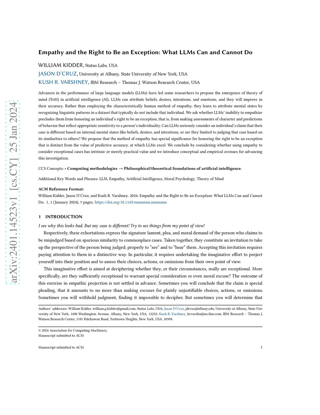 Advances in the performance of large language models (LLMs) have led some researchers to propose the emergence of theory of mind (ToM) in artificial intelligence (AI). LLMs can attribute beliefs, desires, intentions, and emotions, and they will improve in their accuracy. Rather than employing the characteristically human method of empathy, they learn to attribute mental states by recognizing linguistic patterns in a dataset that typically do not include that individual. We ask whether LLMs' inability to empathize precludes them from honoring an individual's right to be an exception, that is, from making assessments of character and predictions of behavior that reflect appropriate sensitivity to a person's individuality. Can LLMs seriously consider an individual's claim that their case is different based on internal mental states like beliefs, desires, and intentions, or are they limited to judging that case based on its similarities to others? We propose that the method of empathy has special significance for honoring the right to be an exception that is distinct from the value of predictive accuracy, at which LLMs excel. We conclude by considering whether using empathy to consider exceptional cases has intrinsic or merely practical value and we introduce conceptual and empirical avenues for advancing this investigation.