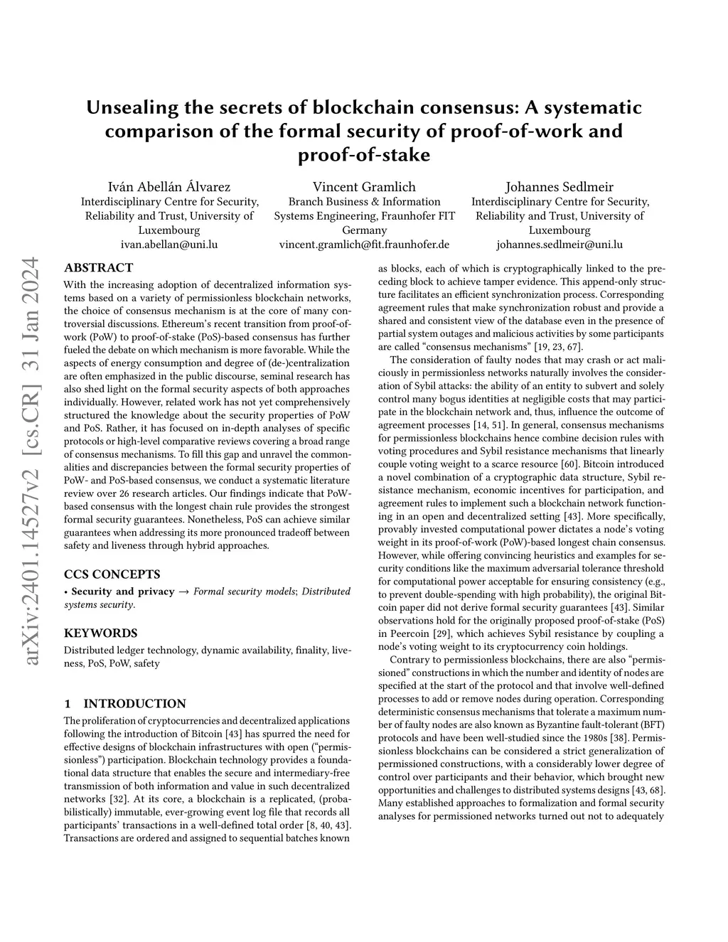 With the increasing adoption of decentralized information systems based on a variety of permissionless blockchain networks, the choice of consensus mechanism is at the core of many controversial discussions. Ethereum's recent transition from (PoW) to proof-of-stake (PoS)-based consensus has further fueled the debate on which mechanism is more favorable. While the aspects of energy consumption and degree of (de-)centralization are often emphasized in the public discourse, seminal research has also shed light on the formal security aspects of both approaches individually. However, related work has not yet comprehensively structured the knowledge about the security properties of PoW and PoS. Rather, it has focused on in-depth analyses of specific protocols or high-level comparative reviews covering a broad range of consensus mechanisms. To fill this gap and unravel the commonalities and discrepancies between the formal security properties of PoW- and PoS-based consensus, we conduct a systematic literature review over 26 research articles. Our findings indicate that PoW-based consensus with the longest chain rule provides the strongest formal security guarantees. Nonetheless, PoS can achieve similar guarantees when addressing its more pronounced tradeoff between safety and liveness through hybrid approaches.