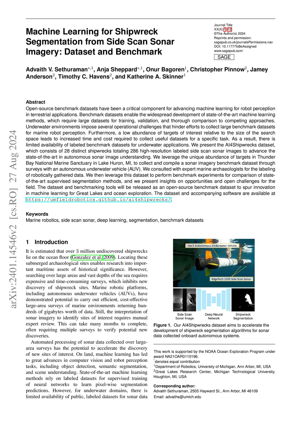 Open-source benchmark datasets have been a critical component for advancing machine learning for robot perception in terrestrial applications. Benchmark datasets enable the widespread development of state-of-the-art machine learning methods, which require large datasets for training, validation, and thorough comparison to competing approaches. Underwater environments impose several operational challenges that hinder efforts to collect large benchmark datasets for marine robot perception. Furthermore, a low abundance of targets of interest relative to the size of the search space leads to increased time and cost required to collect useful datasets for a specific task. As a result, there is limited availability of labeled benchmark datasets for underwater applications. We present the AI4Shipwrecks dataset, which consists of 24 distinct shipwreck sites totaling 286 high-resolution labeled side scan sonar images to advance the state-of-the-art in autonomous sonar image understanding. We leverage the unique abundance of targets in Thunder Bay National Marine Sanctuary in Lake Huron, MI, to collect and compile a sonar imagery benchmark dataset through surveys with an autonomous underwater vehicle (AUV). We consulted with expert marine archaeologists for the labeling of robotically gathered data. We then leverage this dataset to perform benchmark experiments for comparison of state-of-the-art supervised segmentation methods, and we present insights on opportunities and open challenges for the field. The dataset and benchmarking tools will be released as an open-source benchmark dataset to spur innovation in machine learning for Great Lakes and ocean exploration. The dataset and accompanying software are available at https://umfieldrobotics.github.io/ai4shipwrecks/.