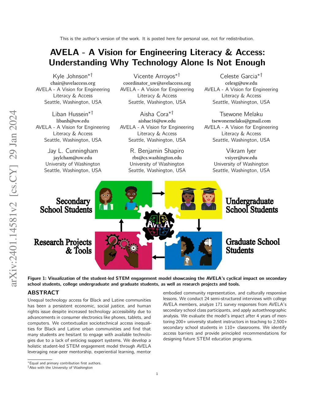 Unequal technology access for Black and Latine communities has been a persistent economic, social justice, and human rights issue despite increased technology accessibility due to advancements in consumer electronics like phones, tablets, and computers. We contextualize socio-technical access inequalities for Black and Latine urban communities and find that many students are hesitant to engage with available technologies due to a lack of engaging support systems. We present a holistic student-led STEM engagement model through AVELA - A Vision for Engineering Literacy and Access leveraging culturally responsive lessons, mentor embodied community representation, and service learning. To evaluate the model's impact after 4 years of mentoring 200+ university student instructors in teaching to 2,500+ secondary school students in 100+ classrooms, we conducted 24 semi-structured interviews with college AnonymizedOrganization members. We identify access barriers and provide principled recommendations for designing future STEM education programs.