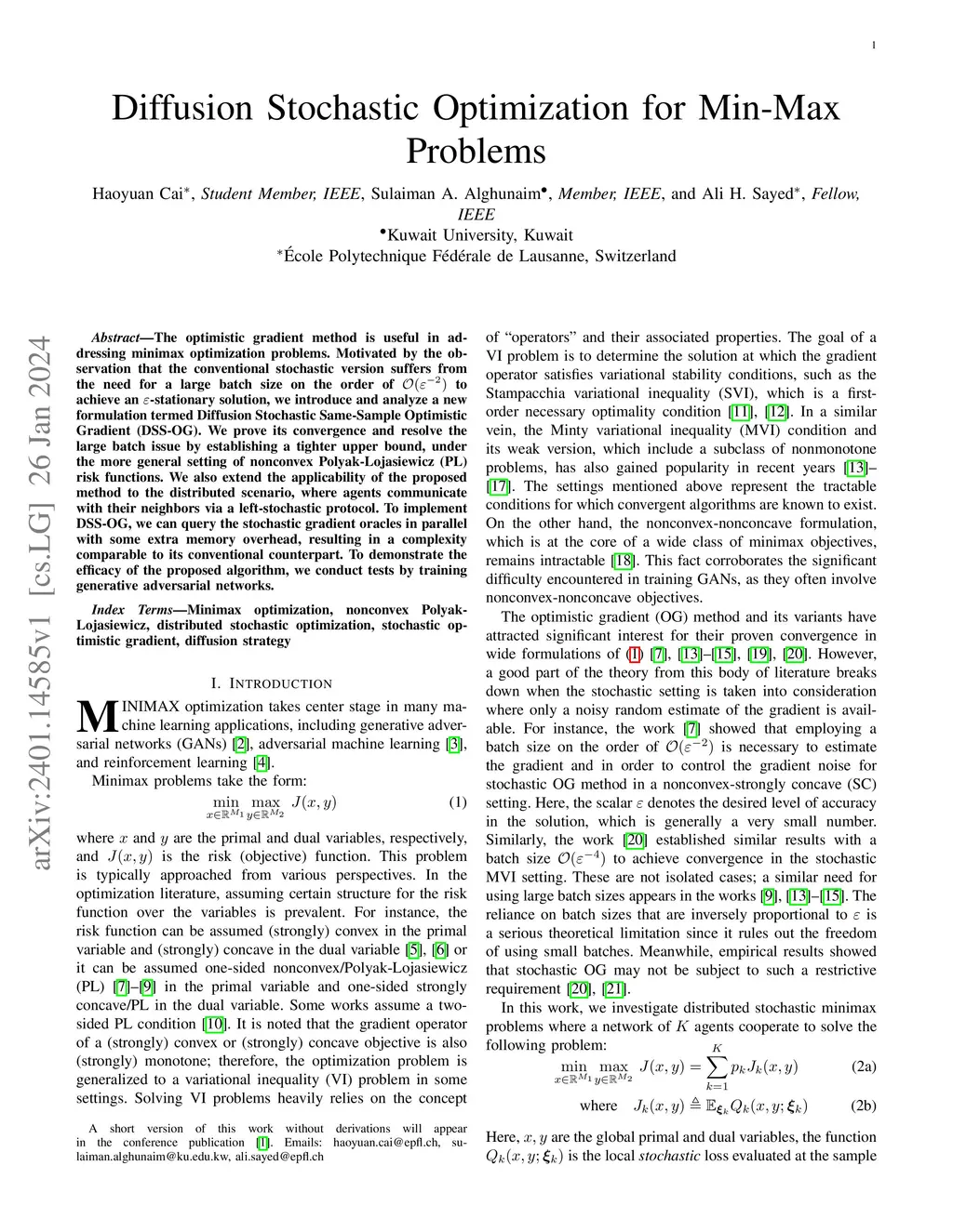 The optimistic gradient method is useful in addressing minimax optimization problems. Motivated by the observation that the conventional stochastic version suffers from the need for a large batch size on the order of to achieve an -stationary solution, we introduce and analyze a new formulation termed Diffusion Stochastic Same-Sample Optimistic Gradient (DSS-OG). We prove its convergence and resolve the large batch issue by establishing a tighter upper bound, under the more general setting of nonconvex Polyak-Lojasiewicz (PL) risk functions. We also extend the applicability of the proposed method to the distributed scenario, where agents communicate with their neighbors via a left-stochastic protocol. To implement DSS-OG, we can query the stochastic gradient oracles in parallel with some extra memory overhead, resulting in a complexity comparable to its conventional counterpart. To demonstrate the efficacy of the proposed algorithm, we conduct tests by training generative adversarial networks.