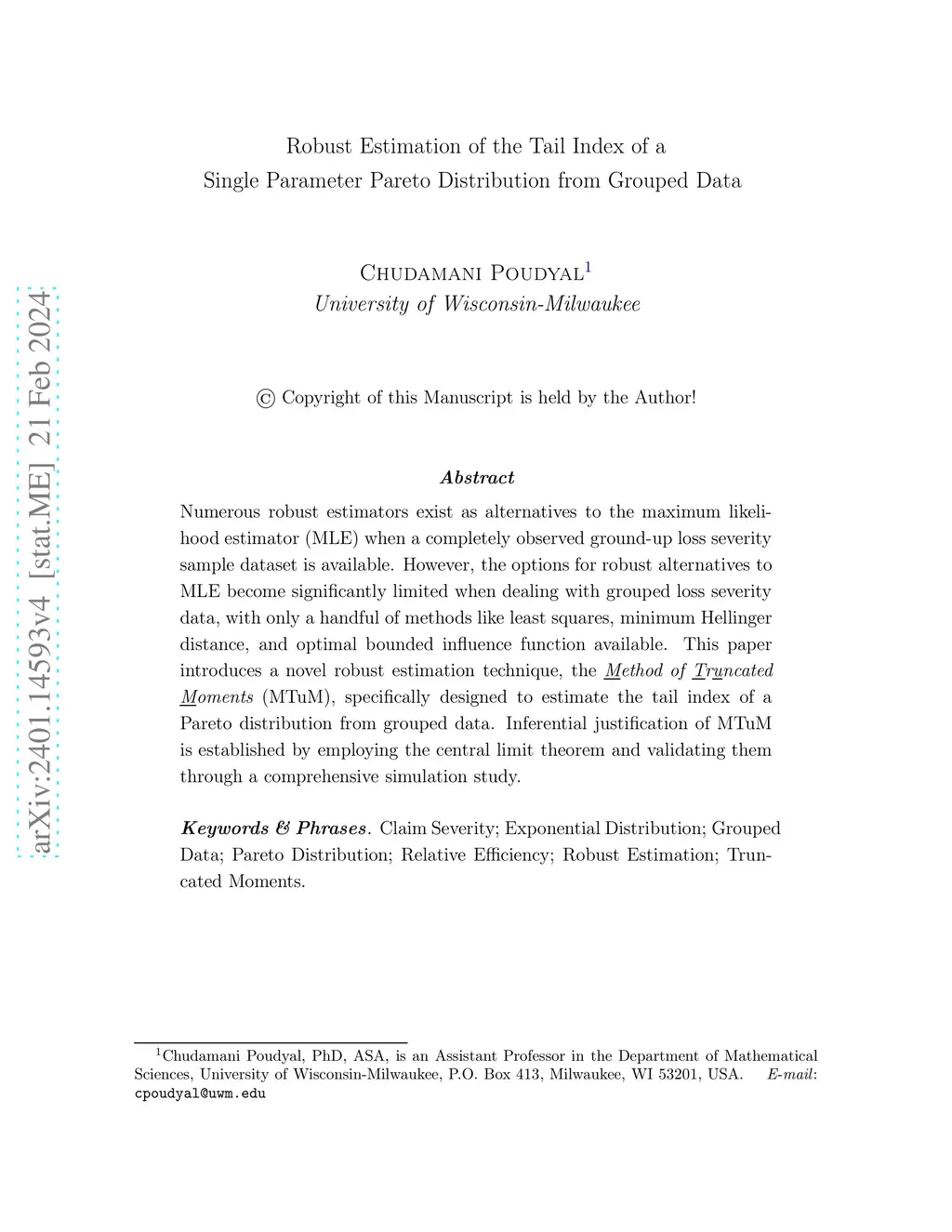 Numerous robust estimators exist as alternatives to the maximum likelihood estimator (MLE) when a completely observed ground-up loss severity sample dataset is available. However, the options for robust alternatives to MLE become significantly limited when dealing with grouped loss severity data, with only a handful of methods like least squares, minimum Hellinger distance, and optimal bounded influence function available. This paper introduces a novel robust estimation technique, the Method of Truncated Moments (MTuM), specifically designed to estimate the tail index of a Pareto distribution from grouped data. Inferential justification of MTuM is established by employing the central limit theorem and validating them through a comprehensive simulation study.